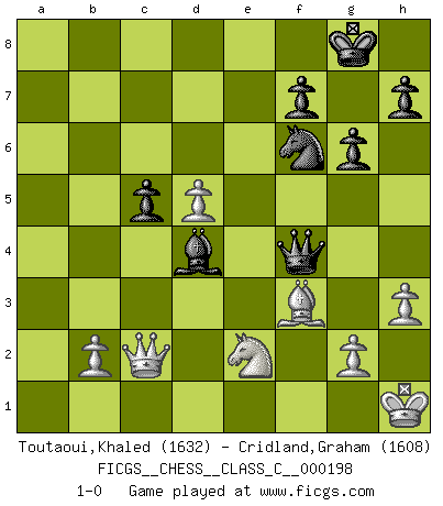 Last move : 1-0 2013 September 12 13:48:57 [Event "FICGS__CHESS__CLASS_C__000198"] [Site "FICGS"] [Date "2013.03.01"] [Round "1"] [White "Toutaoui,Khaled"] [Black "Cridland,Graham"] [Result "1-0"] [WhiteElo "1632"] [BlackElo "1608"] 1.d4 Nf6 2.c4 g6 3.Nc3 Bg7 4.Nf3 O-O 5.e3 d6 6.Be2 c5 7.d5 e6 8.O-O exd5 9.cxd5 a6 10.Re1 b5 11.a3 Bg4 12.h3 Bxf3 13.Bxf3 Nbd7 14.Qc2 Ne5 15.Be2 Rb8 16.f4 Ned7 17.e4 b4 18.axb4 Rxb4 19.Rxa6 Qb8 20.Bd3 Re8 21.Na2 Rd4 22.Be3 Nxe4 23.Bxd4 Bxd4+ 24.Kh1 Ndf6 25.Bxe4 Qb5 26.Rxd6 Qb8 27.Nc3 Qxd6 28.Re2 Qxf4 29.Bf3 Rxe2 30.Nxe2 1-0 This chess game has been lost on time (started : 2013.03.01 13:52:21) King's Indian defense, 3.Nc3 Kingside Castling by player Black (move 4) Kingside Castling by player White (move 8) Player White won this chess game. Follow this game move after move (download)Bobby Fischer's current state of mind is indeed a tragedy. One of the world's greatest Chess players - the pride and sorrow of American Chess. (Frank Brady) Was ist der Unterschied zwischen einem Strassenarbeiter und einem Schachspieler? --Der Schachspieler bewegt sich ab und zu. (Anonymous) La belleza de un movimiento no se refleja solo en su apariencia, sino en el pensamiento detrás de él. (Siegbert Tarrasch) Les Echecs sont affaire de jugement sensible. Savoir quand frapper et quand esquiver. (Fischer) God is an atheist. (Unknown)