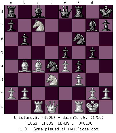 Last move : 1-0 2013 September 13 13:51:7 [Event "FICGS__CHESS__CLASS_C__000198"] [Site "FICGS"] [Date "2013.03.01"] [Round "1"] [White "Cridland,Graham"] [Black "Galanter,Gregory"] [Result "1-0"] [WhiteElo "1608"] [BlackElo "1750"] 1.d4 Nf6 2.c4 g6 3.Nc3 Bg7 4.e4 d6 5.Be2 O-O 6.Nf3 e5 7.O-O Nc6 8.d5 Ne7 9.Ne1 Nd7 10.Bd2 f5 11.f3 f4 12.Nd3 g5 13.Rc1 Nf6 14.c5 c6 15.cxd6 Qxd6 16.dxc6 Nxc6 17.Nb5 Qe7 18.Nc5 b6 19.Bc4+ Kh8 20.Nd3 Nd4 21.Bb4 Qe8 22.Nc7 1-0 This chess game has been lost on time (started : 2013.03.01 13:52:21) King's Indian : 5.Be2 Kingside Castling by player Black (move 5) Kingside Castling by player White (move 7) Player White won this chess game. Follow this game move after move (download)One bad move nullifies forty good ones. (Horowitz) Frage des Reporters: -Welche besonderen Umstände rechtfertigen das Anhalten der Uhren während einer Turnierpartie? Antwort: -Einen Fotographen zu strangulieren. (Siegbert Tarrasch) Un jugador que es sorprendido, esta derrotado a medias. (Proverbio) Toutes les manuvres exécutées sur une colonne ouverte ont pour but ultime l'intrusion définitive sur la septième ou la huitième rangée, en plein cur de la position ennemie. (Aaron Nimzovitch) How many people work in NATO Headquarters ? - About half of them. (Dirk Stikker, NATO general secretary)
