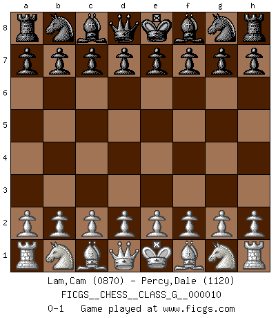 Last move : 0-1 2007 March 8 0:54:40 [Event "FICGS__CHESS__CLASS_G__000010"] [Site "FICGS"] [Date "2007.01.26"] [Round "1"] [White "Lam,Cam"] [Black "Percy,Dale"] [Result "0-1"] [WhiteElo "0870"] [BlackElo "1120"] 0-1 This chess game has been lost on time (started : 2007.01.26 21:59:3) Player Black won this chess game. Follow this game move after move (download)The winner of the game is the player who makes the next-to-last mistake. (Savielly Tartakover) Der Bart als Geschlechtszeichen mitten im Gesicht ist obszön. Daher gefällt er den Weibern. [Zugegeben, kein Schachzitat, aber unglaublich originell] (Arthur Schopenhauer) Con el tiempo, empecé a progresar en partidas decisivas. Tal vez porque me di cuenta de una simple verdad: no solo estaba yo nervioso sino también mi oponente. (Mikhail Tal) Les Echecs ont trois composantes : le temps, l'espace et le matériel en dernier. (Mikhail Tal) Everything in life is luck. (Donald Trump)