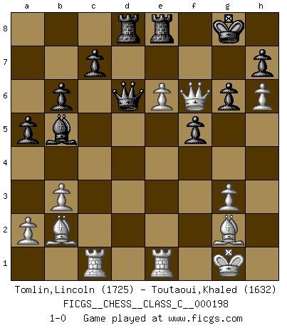Last move : 1-0 2013 July 16 3:21:38 [Event "FICGS__CHESS__CLASS_C__000198"] [Site "FICGS"] [Date "2013.03.01"] [Round "1"] [White "Tomlin,Lincoln"] [Black "Toutaoui,Khaled"] [Result "1-0"] [WhiteElo "1725"] [BlackElo "1632"] 1.c4 e5 2.g3 Nc6 3.Bg2 Nf6 4.Nc3 Be7 5.Nf3 O-O 6.O-O d6 7.d4 exd4 8.Nxd4 Bd7 9.b3 Re8 10.Bb2 Rb8 11.e4 a6 12.Nf5 Ne5 13.Nxe7+ Qxe7 14.f4 Ng6 15.Nd5 Nxd5 16.cxd5 Bb5 17.Re1 Rbd8 18.h4 b6 19.h5 Nf8 20.Rc1 a5 21.Qg4 f6 22.e5 dxe5 23.fxe5 Bd7 24.e6 Bb5 25.h6 g6 26.Qf3 f5 27.Qf4 Qd6 28.Qd4 Nxe6 29.Qh8+ Kf7 30.Qf6+ Kg8 31.dxe6 1-0 English Opening Kingside Castling by player Black (move 5) Kingside Castling by player White (move 6) Player White won this chess game. Follow this game move after move (download)There are two types of sacrifices: correct ones and mine. (Mikhail Tal) Im Schach nämlich geht es darum, daß Ich des Gegners klein zu kriegen, sein Ego zu zerbrechen und zu zermahlen, seine Selbstachtung zu zertreten und zu verscharren und seine ganze mißachtenswerte sogenannte Persönlichkeit ein für alle Mal tot zu hacken und zu zerstampfen und dadurch die menschliche Gesellschaft von einer stinkenden Pestbeule zu befreien. Es ist ein königliches Spiel. (Robert James Fischer) ¿Porque tengo que perder ante este idiota?. (Aron Nimzovich) Je fais ceci parce que dans cinquante coups j'obtiendrai cela; je m'appelle Mikhail Moisevitch Botvinnik. (Botvinnik) Plans are ideas that never come to fruition. (Daniel Parmet)