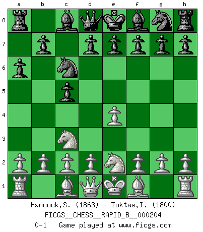 Last move : 0-1 2013 April 27 21:26:12 [Event "FICGS__CHESS__RAPID_B__000204"] [Site "FICGS"] [Date "2013.03.02"] [Round "1"] [White "Hancock,Sarah"] [Black "Toktas,Ibrahim Ugras"] [Result "0-1"] [WhiteElo "1863"] [BlackElo "1800"] 1.e4 c5 2.Nc3 Nc6 3.Nge2 a6 0-1 This chess game has been lost on time (started : 2013.03.02 15:42:44) Sicilian : chameleon variation Player Black won this chess game. Follow this game move after move (download)We like to think. (Gary Kasparov) Im Blitz ist es einfacher mit einer Figur weniger anzugreifen, als sich mit einer Mehrfigur zu verteidigen. (Mikhail Nekhemyevich Tal) Aquel que ve no otra dirección en el juego que la de dar Jaque Mate a su oponente, nunca será un buen jugador de Ajedrez. (Euwe) Horreur, mais aussi harmonie suprême : qu'y avait-il en effet au monde en dehors des échecs ? Le brouillard, l'inconnu, le non-être... (Vladimir Nabokov) You can't play chess if you're groggy from pills. (Anatoly Karpov)