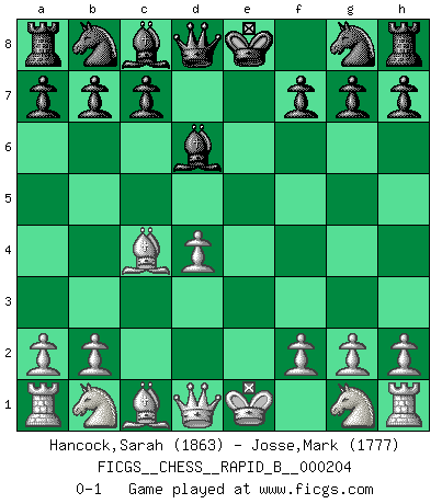 Last move : 0-1 2013 April 25 21:12:48 [Event "FICGS__CHESS__RAPID_B__000204"] [Site "FICGS"] [Date "2013.03.02"] [Round "1"] [White "Hancock,Sarah"] [Black "Josse,Mark"] [Result "0-1"] [WhiteElo "1863"] [BlackElo "1777"] 1.d4 d5 2.c4 dxc4 3.e3 e5 4.Bxc4 exd4 5.exd4 Bd6 0-1 This chess game has been lost on time (started : 2013.03.02 15:42:44) Queen's gambit accepted Player Black won this chess game. Follow this game move after move (download)The game of chess is the touchstone of the intellect. (Goethe) Wenn Spassky eine Figur opfert kannst du genauso gut aufgeben. Aber wenn Tal eine Figur opfert, spiel weiter. Er könnte noch eine weitere opfern, und dann ... wer weiß? (Miguel Najdorf) En la perfecta combinación de Ajedrez como en una historia corta de primera clase, toda la trama y contra trama deberá conducir hacia un final sorprendente, el interes no es mitigado hasta el último momento. (Yates and Winter) Tous ces prétendus hommes politiques sont les pions, les Cavaliers, les Tours ou les Fous d'une partie d'échecs qui se jouera tant qu'un hasard ne renversera pas l'échiquier. (Honoré de Balzac) There are more things in heaven and earth than practically anywhere else. (Unknown)