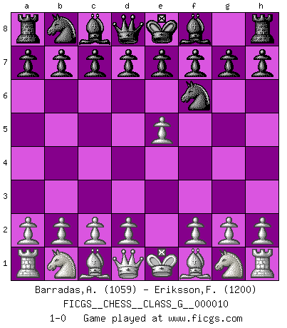 Last move : 1-0 2007 March 9 19:4:57 [Event "FICGS__CHESS__CLASS_G__000010"] [Site "FICGS"] [Date "2007.01.26"] [Round "1"] [White "Barradas,Anderson"] [Black "Eriksson,Fredrik"] [Result "1-0"] [WhiteElo "1059"] [BlackElo "1200"] 1.e4 Nf6 2.e5 1-0 This chess game has been lost on time (started : 2007.01.26 21:59:3) Alekhine's defense Player White won this chess game. Follow this game move after move (download)Methodical thinking is of more use in Chess than inspiration. (C. J. S. Purdy) Gewinnen beim Schach fördert das Selbstvertrauen. Beim Sex spüre ich sowas nicht... (Garry Kasparov) El Ajedrez es tortura mental. (Garry Kasparov) Vouloir jouer aux échecs contre soi-même est aussi paradoxal que vouloir marcher sur son ombre. (Stefan Zweig) In fact if nothing is done against this teddy bear, hereby I announce that I would quit chess, rapid chess, blitz chess, postal chess, email chess, server chess and correspondence chess I will then switch to a table game where teddy bears aren't going to be seen for a while, like Poker, or Roulette, all 18+ games. (Elmer Valderrama)