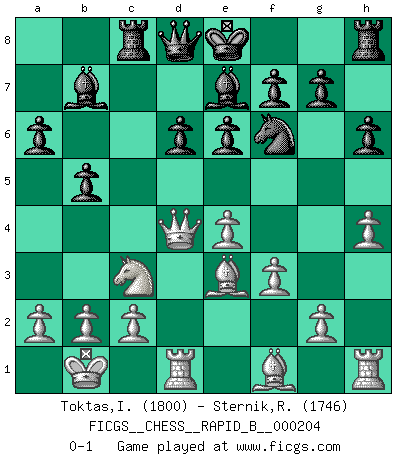 Last move : 0-1 2013 April 20 9:6:18 [Event "FICGS__CHESS__RAPID_B__000204"] [Site "FICGS"] [Date "2013.03.02"] [Round "1"] [White "Toktas,Ibrahim Ugras"] [Black "Sternik,Ryszard"] [Result "0-1"] [WhiteElo "1800"] [BlackElo "1746"] 1.e4 c5 2.Nf3 Nc6 3.d4 cxd4 4.Nxd4 Nf6 5.Nc3 d6 6.Bg5 e6 7.Qd2 a6 8.O-O-O h6 9.Be3 Be7 10.f3 Nxd4 11.Qxd4 b5 12.Kb1 Bb7 13.h4 Rc8 0-1 This chess game has been lost on time (started : 2013.03.02 15:42:44) Sicilian defense Queenside Castling by player White (move 8) Player Black won this chess game. Follow this game move after move (download)All Chess players should have a hobby. (Savielly Tartakower) Im Reiche der Wirklichkeit ist man nie so glücklich wie im Reiche der Gedanken. (Arthur Schopenhauer) Por tratar de evitar la pérdida de una pieza, muchas personas han perdido una partida de Ajedrez. (Savielly Tartakover) La conception d'un plan est le processus par lequel un joueur exploite les avantages de sa position tout en s'efforçant d'en réduire au minimum les inconvénients. Afin de garantir le succès, un plan doit toujours se fonder sur un diagnostic objectif des particularités d'une position. La conception d'un plan est d'autant plus difficile que la position est équilibrée, et grandement facilitée lorsqu'il n'existe qu'un seul plan susceptible de répondre aux exigences de la position. (Harry Golombek) Mac users swear by their computers. PC users swear at their computers. (Author unknown)