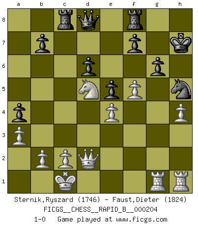 Last move : 1-0 2013 March 27 11:28:19 [Event "FICGS__CHESS__RAPID_B__000204"] [Site "FICGS"] [Date "2013.03.02"] [Round "1"] [White "Sternik,Ryszard"] [Black "Faust,Dieter"] [Result "1-0"] [WhiteElo "1746"] [BlackElo "1824"] 1.e4 c5 2.Nf3 d6 3.d4 cxd4 4.Nxd4 Nf6 5.Nc3 g6 6.Be3 Bg7 7.f3 Nc6 8.Qd2 O-O 9.O-O-O a6 10.g4 Nxd4 11.Bxd4 Be6 12.h4 h5 13.gxh5 Nxh5 14.Bxg7 Kxg7 15.f4 Bg4 16.Be2 Bxe2 17.Nxe2 a5 18.f5 e5 19.Rdg1 Rc8 20.Nc3 Kh7 21.Nd5 a4 22.a3 1-0 Sicilian : Dragon, Yugoslav attack Kingside Castling by player Black (move 8) Queenside Castling by player White (move 9) Player White won this chess game. Follow this game move after move (download)That's what Chess is all about. One day you give your opponent a lesson, the next day he gives you one. (Bobby Fischer) Nur ein wirklich starker Spieler weiß wie schwach er spielt. (Savielly Grigorievitsch Tartakower) Es el objetivo de la escuela moderna no tratar cada posición de acuerdo a una regla general, sino de acuerdo al principio inherente en la posición. (Richard Reti) RxDa4 pat (...) All the biggest technological inventions created by man - the airplane, the automobile, the computer - says little about his intelligence, but speaks volumes about his laziness. (Mark Kennedy)