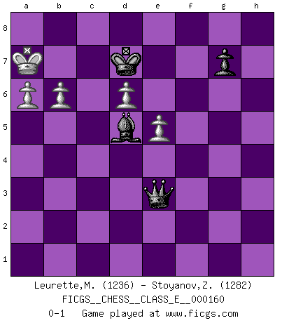 Last move : 0-1 2013 April 16 21:34:33 [Event "FICGS__CHESS__CLASS_E__000160"] [Site "FICGS"] [Date "2013.03.04"] [Round "1"] [White "Leurette,Marc-Antoine"] [Black "Stoyanov,Zdravko"] [Result "0-1"] [WhiteElo "1236"] [BlackElo "1282"] 1.e4 c5 2.Nc3 a6 3.Nf3 Nc6 4.d4 cxd4 5.Nxd4 Nxd4 6.Qxd4 h6 7.Bc4 e6 8.Bd2 Nf6 9.O-O-O Be7 10.e5 Ng8 11.Be3 d5 12.Bb3 Bg5 13.Bxg5 Qxg5+ 14.Qe3 Qxg2 15.Qg3 Qxg3 16.hxg3 Ne7 17.f4 O-O 18.g4 b5 19.g5 Nf5 20.gxh6 Nxh6 21.Ne2 a5 22.c3 Ng4 23.Rdg1 Nf2 24.Rh2 Nd3+ 25.Kc2 Nc5 26.Rgh1 f5 27.Rh8+ Kf7 28.Nd4 Rxh8 29.Rxh8 Bb7 30.Rxa8 Bxa8 31.Nxb5 a4 32.Nd6+ Kg6 33.Bxa4 Nxa4 34.b3 Nc5 35.b4 Ne4 36.Kd3 Nxd6 37.exd6 Kf7 38.c4 dxc4+ 39.Kxc4 Ke8 40.Kc5 Kd7 41.a4 e5 42.fxe5 f4 43.a5 f3 44.a6 f2 45.Kb6 f1Q 46.Ka7 Qf3 47.b5 Bd5 48.b6 Qe3 0-1 Sicilian : Closed Queenside Castling by player White (move 9) Kingside Castling by player Black (move 17) 10 pieces endgame at move 39 : White KPPPP , Black KBPPP WHITE : King + 4 Pawns BLACK : King + 1 Bishop 3 Pawns 9 pieces endgame at move 42 : White KPPPP , Black KBPP WHITE : King + 4 Pawns BLACK : King + 1 Bishop 2 Pawns Promotion Queen by player Black (move 45) Player Black won this chess game. Follow this game move after move (download)A man that will take back a move at Chess will pick a pocket. (Richard Fenton) Schach ist ein Reich, wo sich die menschliche Phantasie frei entfalten kann. (David Bronstein) No todos los artistas son jugadores de Ajedrez, pero todos los jugadores de Ajedrez son artistas. (Marcel Duchamp) Les échecs sont un jeu terrible. Si vous n'avez pas le centre, votre adversaire a une position plus libre. Par contre, si vous avez le centre, alors vous avez vraiment quelque chose pour laquelle vous inquiéter ! (Siegbert Tarrasch) Tree pose grows confidence. It roots me to this world. (Terri Guillemets)