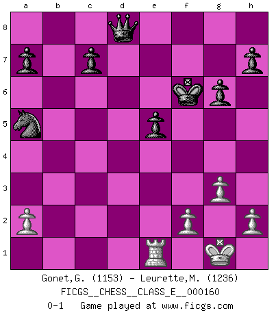 Last move : 0-1 2013 April 6 17:33:56 [Event "FICGS__CHESS__CLASS_E__000160"] [Site "FICGS"] [Date "2013.03.04"] [Round "1"] [White "Gonet,Gerard"] [Black "Leurette,Marc-Antoine"] [Result "0-1"] [WhiteElo "1153"] [BlackElo "1236"] 1.d4 e6 2.e4 d5 3.c4 Bb4+ 4.Bd2 Bxd2+ 5.Nxd2 Nf6 6.e5 Ne4 7.Nxe4 dxe4 8.Qc2 Qxd4 9.Rd1 Qxe5 10.Be2 Nc6 11.Qa4 Qxb2 12.c5 Qc3+ 13.Kf1 Qxc5 14.Qxe4 O-O 15.Nf3 Rd8 16.g3 Rxd1+ 17.Bxd1 e5 18.Kg2 g6 19.Bb3 Nd4 20.Ng5 Nxb3 21.Re1 Bf5 22.Qxb7 Na5 23.Qxa8+ Kg7 24.Qe8 Be6 25.Qxe6 fxe6 26.Nxe6+ Kf6 27.Nd8 Qd5+ 28.Kg1 Qxd8 0-1 Queen's pawn Kingside Castling by player Black (move 14) Player Black won this chess game. Follow this game move after move (download)Chess is a part of culture and if a culture is declining then Chess too will decline. (Mikhail Botvinnik) Das Schachspiel hat wie die Liebe, die Musik, die Fähigkeit, den Menschen glücklich zu machen. Ich habe ein leises Gefühl des Bedauerns für jeden, der das Schachspiel nicht kennt, so wie ich jeden bedaure, der die Liebe nicht kennt. (Siegbert Tarrasch) El sobresalir en el Ajedrez es un signo de una mente intrigante. (Sir Arthur Conan Doyle) Les échecs sont utiles à l'exercice de la faculté de penser et à celle de l'imagination. Car nous devons posséder une méthode élaborée pour atteindre des buts partout où nous devons conduire notre raison. (Leibnitz) A generalist learns less and less about more and more until he knows nothing about everything. (Author unknown)