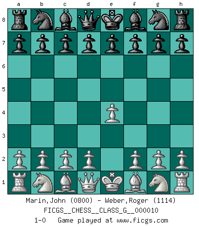 Last move : 1-0 2007 March 8 0:54:40 [Event "FICGS__CHESS__CLASS_G__000010"] [Site "FICGS"] [Date "2007.01.26"] [Round "1"] [White "Marin,John"] [Black "Weber,Roger"] [Result "1-0"] [WhiteElo "0800"] [BlackElo "1114"] 1.e4 1-0 This chess game has been lost on time (started : 2007.01.26 21:59:3) King's pawn Opening Player White won this chess game. Follow this game move after move (download)On the chessboard, lies and hypocrisy do not survive long. (Emanuel Lasker) Stelle das Brett so, daß die Sonne in die Augen deines Gegners scheint. (Ruy López) La batalla por la última verdad nunca sera ganada. Y es por eso que el Ajedrez es tan fascinante. (Hans Kmoch) En blitz, le Cavalier l'emporte sur le Fou. (Vlastimil Hort) Pushing plastic is for the many, pushing virtual pieces is for the fewer, pushing wood is for the very few. (Normajean Yates)