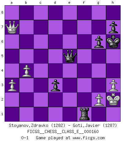 Last move : 0-1 2013 April 23 20:44:46 [Event "FICGS__CHESS__CLASS_E__000160"] [Site "FICGS"] [Date "2013.03.04"] [Round "1"] [White "Stoyanov,Zdravko"] [Black "Goti,Javier"] [Result "0-1"] [WhiteElo "1282"] [BlackElo "1287"] 1.e4 c5 2.Nf3 Nc6 3.Bb5 g6 4.Bxc6 bxc6 5.d3 Bg7 6.c3 Nf6 7.Ne5 O-O 8.h3 Bb7 9.c4 d5 10.cxd5 cxd5 11.O-O Nd7 12.Nxd7 Qxd7 13.Nd2 e6 14.Re1 e5 15.Nb3 Qd6 16.Na5 Ba6 17.a3 f5 18.Rb1 fxe4 19.dxe4 Qf6 20.f3 dxe4 21.Rxe4 Rad8 22.Qb3+ Kh8 23.Nc4 Rd4 24.Rxd4 cxd4 25.Bd2 Bxc4 26.Qxc4 e4 27.fxe4 Qf2+ 28.Kh2 Qxd2 29.Qb3 Qf4+ 30.Kh1 Qxe4 31.Rd1 Qe2 32.Rd3 Rf1+ 33.Kh2 Be5+ 34.Rg3 Bxg3+ 35.Qxg3 d3 36.Qb8+ Kg7 37.Qxa7+ Kh6 38.b4 Qe5+ 0-1 Sicilian : Nimzovich-Rossolimo attack (with ...g6, without ...d6) Kingside Castling by player Black (move 7) Kingside Castling by player White (move 11) Player Black won this chess game. Follow this game move after move (download)The passion for playing Chess is one of the most unaccountable in the world. (H.G. Wells) Dieses schreckliche Gefühl, dass ich gegen eine Maschine spielte, die niemals Fehler macht, zerschmetterte meinen Widerstand. (Mark Taimanov) Solo los afeminados hacen el Enroque. (Rob Sillars) Le thème de l'attaque double intervient d'une manière ou d'une autre dans l'immense majorité des combinaisons. (Youri Averbakh) The hypothalamus is one of the most important parts of the brain, involved in many kinds of motivation, among other functions. The hypothalamus controls the 'Four Fs: Fighting, Fleeing, Feeding and Mating. (Unknown author)