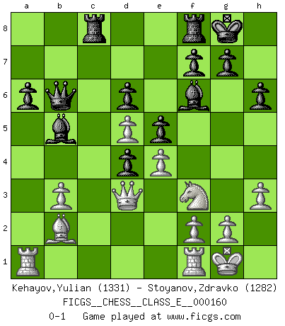Last move : 0-1 2013 March 7 22:39:33 [Event "FICGS__CHESS__CLASS_E__000160"] [Site "FICGS"] [Date "2013.03.04"] [Round "1"] [White "Kehayov,Yulian"] [Black "Stoyanov,Zdravko"] [Result "0-1"] [WhiteElo "1331"] [BlackElo "1282"] 1.e4 c5 2.c4 Nc6 3.Nf3 e5 4.Be2 Nf6 5.d3 h6 6.Nc3 Be7 7.O-O O-O 8.h3 d6 9.b3 a6 10.Nd5 Nxd5 11.cxd5 Na7 12.a4 b5 13.axb5 Nxb5 14.d4 Nc3 15.Qc2 Nxe2+ 16.Qxe2 cxd4 17.Nd2 Bh4 18.Nf3 Bf6 19.Bb2 Qb6 20.Qc4 Bd7 21.Qc2 Rac8 22.Qd3 Bb5 0-1 Sicilian defense Kingside Castling by player White (move 7) Kingside Castling by player Black (move 7) Player Black won this chess game. Follow this game move after move (download)Fischer is an American Chess tragedy on par with Morphy and Pillsbury. (Mig Greengard) Gegen einen Schachcomputer zu verlieren ist wie Löcher in den Strümpfen zuhaben. Es ist nicht peinlich, solange man der einzige ist der es weiß. (Anonymous) Un juego de Ajedrez es un dialogo, una conversación entre un jugador y su oponente. Cada movimiento del oponente puede contener amenazas o tropiezos, pero un jugador no se puede defender de las amenazas o tomar ventaja de los tropiezos si es que no se pregunta a sí mismo: ¿Que es lo que mi oponente va a hacer después de cada movida?. (Bruce A. Moon) Les Echecs sont affaire de jugement sensible. Savoir quand frapper et quand esquiver. (Fischer) A clear conscience is usually the sign of a bad memory. (Unknown)