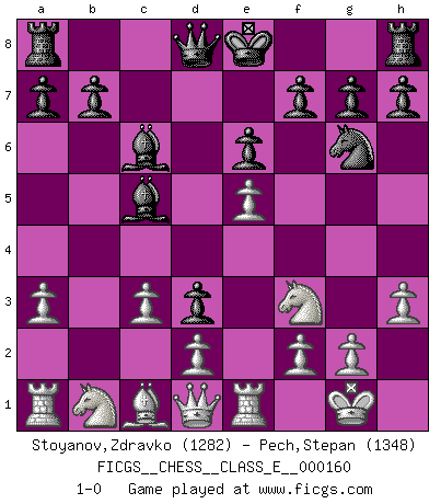 Last move : 1-0 2013 May 26 12:21:26 [Event "FICGS__CHESS__CLASS_E__000160"] [Site "FICGS"] [Date "2013.03.04"] [Round "1"] [White "Stoyanov,Zdravko"] [Black "Pech,Stepan"] [Result "1-0"] [WhiteElo "1282"] [BlackElo "1348"] 1.e4 d5 2.e5 c5 3.h3 e6 4.Nf3 Nc6 5.c3 Nge7 6.Bb5 Bd7 7.Bxc6 Bxc6 8.O-O d4 9.a3 d3 10.b4 Ng6 11.bxc5 Bxc5 12.Re1 1-0 Scandinavian (centre counter) defense Kingside Castling by player White (move 8) Player White won this chess game. Follow this game move after move (download)One bad move nullifies forty good ones. (Horowitz) Es genügt nicht ein guter Spieler zu sein, man muß auch gut spielen. (Siegbert Tarrasch) Los Peones son nacidos libres, y aún así, se encuentran por doquier encadenados. (Rick Kennedy) La tactique, c'est ce que vous faites quand il y a quelque chose à faire; la stratégie, c'est ce que vous faites quand il n'y a rien à faire. (Savielli Tartacower) A shortcut is the longest distance between two points. (Don Groves)
