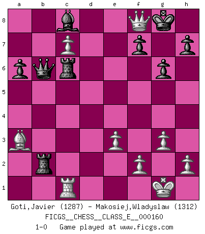 Last move : 1-0 2013 August 26 17:45:59 [Event "FICGS__CHESS__CLASS_E__000160"] [Site "FICGS"] [Date "2013.03.04"] [Round "1"] [White "Goti,Javier"] [Black "Makosiej,Wladyslaw"] [Result "1-0"] [WhiteElo "1287"] [BlackElo "1312"] 1.c4 g6 2.e3 Bg7 3.Nc3 c5 4.Nge2 Nf6 5.g3 Nc6 6.Bg2 d6 7.O-O O-O 8.a3 a6 9.b4 cxb4 10.axb4 Nxb4 11.d4 Nc6 12.Rb1 Rb8 13.Ba3 Re8 14.d5 Ne5 15.c5 Nc4 16.Qa4 Nd2 17.c6 Nxf1 18.Kxf1 Qc7 19.Kg1 bxc6 20.Rc1 Bd7 21.dxc6 Be6 22.Nf4 Bc8 23.Ncd5 Nxd5 24.Nxd5 Qa7 25.c7 Rb5 26.Nxe7+ Rxe7 27.Bxd6 Re6 28.Bc6 Rb2 29.Qd1 Qb6 30.Ba3 Rxc6 31.Qd8+ Bf8 32.Qxf8+ 1-0 English Opening Kingside Castling by player White (move 7) Kingside Castling by player Black (move 7) Player White won this chess game. Follow this game move after move (download)Chess is a foolish expedient for making idle people believe they are doing something very clever when they are only wasting their time. (George Bernard Shaw) Schach ist das schnellste Spiel der Welt, weil man in jeder Sekunde Tausende von Gedanken ordnen muß. (Albert Einstein) Un jugador que trata de regresar una movida en el Ajedrez es un futuro carterista. (Richard Fenton) Les échecs sont un jeu par leur forme, un art par leur essence et une science par sa difficulté d'acquisition. Ils peuvent vous procurer autant de plaisir qu'un bon livre ou une belle musique, mais vous n'aurez une réelle joie que si vous arrivez à bien jouer. (Tigran Petrosian) When you have everything, sometimes it feels like nothing. (Horatio Caine, C.S.I. Miami)