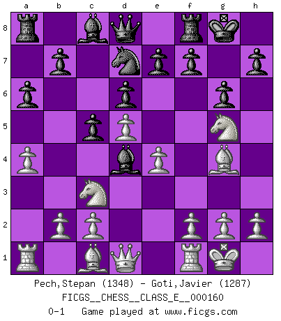 Last move : 0-1 2013 May 26 12:21:34 [Event "FICGS__CHESS__CLASS_E__000160"] [Site "FICGS"] [Date "2013.03.04"] [Round "1"] [White "Pech,Stepan"] [Black "Goti,Javier"] [Result "0-1"] [WhiteElo "1348"] [BlackElo "1287"] 1.d4 g6 2.e4 Bg7 3.Nc3 d6 4.Nf3 Nf6 5.Be2 O-O 6.O-O c5 7.d5 Ng4 8.Ng5 Bd4 9.Bxg4 Nd7 10.a4 a6 0-1 Modern defense Kingside Castling by player Black (move 5) Kingside Castling by player White (move 6) Player Black won this chess game. Follow this game move after move (download)The Pawns are the soul of the game. (Francois Andre Danican Philidor) Sicherlich können nur Meister einen Stil haben. Daß ein nicht-Meister auch nur ein einziges Mal in seinem Leben eine Partie folgerecht durchführte, habe ich niemals bemerkt. (Emanuel Lasker) Personalmente, yo prefiero mirar hacia el futuro en donde un programa de computadora gane el título mundial de Ajedrez. La humanidad necesita una lección de humildad. (Richard Dawkings) Je ne crois pas en la psychologie, je crois aux bons coups. (Robert Fischer) I just play for fun. (Anna Kournikova)