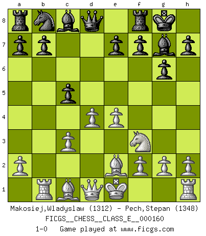 Last move : 1-0 2013 April 23 9:6:53 [Event "FICGS__CHESS__CLASS_E__000160"] [Site "FICGS"] [Date "2013.03.04"] [Round "1"] [White "Makosiej,Wladyslaw"] [Black "Pech,Stepan"] [Result "1-0"] [WhiteElo "1312"] [BlackElo "1348"] 1.d4 Nf6 2.c4 g6 3.Nc3 d5 4.cxd5 Nxd5 5.e4 Nxc3 6.bxc3 Bg7 7.Nf3 c5 8.Rb1 O-O 9.Be2 1-0 This chess game has been lost on time (started : 2013.03.04 3:13:35) King's Indian defense, 3.Nc3 Kingside Castling by player Black (move 8) Player White won this chess game. Follow this game move after move (download)Place the contents of the Chess box in a hat, shake them up vigorously, pour them on the board from a height of two feet, and you get the style of Steinitz. (H. E. Bird) Kann Schach nicht schließlich das Nationalspiel der Deutschen werden? Und welche weiteren Ausblicke bieten sich dann dar! Welche Hebung des allgemeinen Kultur-Niveaus, ja der Moral, wenn das Schachbrett den Kartentisch verdrängen würde! Wahrlich, ein Ziel, des Schweißes der Edlen wert! (Siegbert Tarrasch) Aquellos que dicen que entienden al Ajedrez, no entienden nada. (Robert Hubner) A chaque perte on perd un peu de soi. (Joël Lautier) The real danger is not that computers will begin to think like men, but that men will begin to think like computers. (Sydney J. Harris)