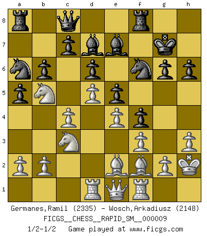 Last move : 1/2-1/2 2013 May 26 15:55:39 [Event "FICGS__CHESS__RAPID_SM__000009"] [Site "FICGS"] [Date "2013.03.04"] [Round "1"] [White "Germanes,Ramil"] [Black "Wosch,Arkadiusz"] [Result "1/2-1/2"] [WhiteElo "2335"] [BlackElo "2148"] 1.d4 Nf6 2.Nf3 g6 3.c4 Bg7 4.Nc3 O-O 5.e4 d6 6.h3 e5 7.d5 a5 8.Bg5 Na6 9.Be2 h6 10.Be3 Nc5 11.Nd2 Bd7 12.O-O b6 13.Qc2 Nh7 14.Nb5 Ng5 15.Kh1 f5 16.f3 f4 17.Bf2 Bf6 18.Qd1 Nh7 19.Qe1 Kg7 20.Nb1 Be7 21.N1c3 Qc8 22.Kh2 Nf6 23.Rd1 Na6 1/2-1/2 King's Indian : East Indian defense Kingside Castling by player Black (move 4) Kingside Castling by player White (move 12) This chess game ended in a draw. Follow this game move after move (download)Blessed be the memory of him who gave the world this immortal game. (A. G. Gardiner) Ich hatte meine größten Erfolge, als ich 47 Jahre alt war. Kasparow war noch nicht mal 42 und hat das Schach schon im Stich gelassen. (Viktor Kortschnoi) Bobby es la celebridad menos entendida y malinterpretada que camina el la faz de esta tierra. (Yasser Seirawan) Les ravages du H expliquent la différence de niveau entre Tal et Thal [Abergel]. I'm extremely disappointed. I send you out for exciting, new designer drugs, you come back with tomato sauce. (Gregory House, House M.D.)
