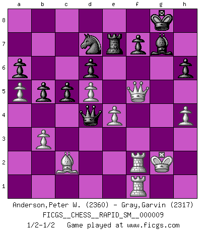 Last move : 1/2-1/2 2013 June 1 10:48:4 [Event "FICGS__CHESS__RAPID_SM__000009"] [Site "FICGS"] [Date "2013.03.04"] [Round "1"] [White "Anderson,Peter W."] [Black "Gray,Garvin"] [Result "1/2-1/2"] [WhiteElo "2360"] [BlackElo "2317"] 1.d4 Nf6 2.c4 e6 3.Nc3 c5 4.d5 exd5 5.cxd5 d6 6.Nf3 g6 7.Bf4 a6 8.a4 Bg7 9.h3 O-O 10.e3 Qe7 11.Be2 Nbd7 12.O-O Rb8 13.a5 Ne8 14.Nd2 Nc7 15.Nc4 Ne5 16.Nb6 Na8 17.Nxc8 Rfxc8 18.Ne4 Nc7 19.Bg5 Qf8 20.f4 Nd7 21.f5 Re8 22.Bd3 b5 23.Bb1 Rbd8 24.Bxd8 Rxd8 25.Ra2 Ne8 26.b3 Qe7 27.Raf2 Nef6 28.Qf3 Nxe4 29.Bxe4 g5 30.f6 Nxf6 31.Bc2 h6 32.Kh1 Qe5 33.e4 Qd4 34.g3 Rc8 35.Kh2 Rc7 36.Kg2 Re7 37.Qf5 Nd7 38.h4 gxh4 39.gxh4 1/2-1/2 Comment by player 1 : Peter W. Anderson : Superbly defended by Garvin. 23...Rbd8!! defending the N on d7 25...Ne8! and black is quite safe. 24.Ra2 was probably a better try but after 24...Re5 black has excelllent drawing chances. Queen's pawn game Kingside Castling by player Black (move 9) Kingside Castling by player White (move 12) This chess game ended in a draw. Follow this game move after move (download)If one piece is badly posted, the whole game is bad. (Tarrasch) Frage: Was machen Sie mit den Preisen? Anwort: Ich habe Angst, dass meine Freundin davon neue Kleider kauft. (Loek van Wely) Las leyes del Ajedrez no permiten una libre elección: tienes que mover quieras o no. (Emanuel Lasker) 'L'échange des dames est un coup dur pour les deux adversaires...' Un journaliste lors d'une partie du match Spassky-Fischer Statistics can be made to prove anything - even the truth. (Author unknown)