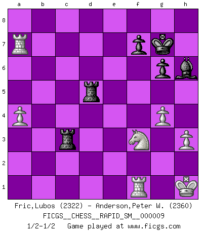 Last move : 1/2-1/2 2013 June 17 13:6:53 [Event "FICGS__CHESS__RAPID_SM__000009"] [Site "FICGS"] [Date "2013.03.04"] [Round "1"] [White "Fric,Lubos"] [Black "Anderson,Peter W."] [Result "1/2-1/2"] [WhiteElo "2322"] [BlackElo "2360"] 1.e4 g6 2.d4 Bg7 3.Nf3 d6 4.Nc3 Nf6 5.h3 O-O 6.Be3 a6 7.a4 d5 8.e5 Ne4 9.Nxe4 dxe4 10.Ng5 c5 11.dxc5 Qc7 12.c3 Nc6 13.Qc2 Nxe5 14.Nxe4 Be6 15.f4 Bh6 16.Qf2 Nc4 17.Bxc4 Bxc4 18.Qh4 Bg7 19.Ng5 h6 20.Nf3 Qd7 21.Kf2 Qd3 22.Nd4 Qe4 23.Rhe1 e5 24.Nf3 Qc2+ 25.Kg1 exf4 26.Bxf4 Qxb2 27.Bxh6 Bxh6 28.Qxc4 Rae8 29.Kh1 Qc2 30.Rf1 Qe4 31.Qb4 Re7 32.Rab1 Rc8 33.Qxe4 Rxe4 34.Rxb7 Rf4 35.g3 Rf5 36.Rb6 R8xc5 37.g4 Rfd5 38.Rxa6 Rxc3 39.Ra8+ Kg7 40.Ra7 1/2-1/2 Robatsch (Modern) defense Kingside Castling by player Black (move 5) This chess game ended in a draw. Follow this game move after move (download)With or without the title, Bobby Fischer was unquestionably the greatest player of his time. (Burt Hochberg) Computer sind die einzigen Gegner, die nicht immer eine Ausrede auf Lager haben, wenn sie gegen mich verlieren. (Robert James Fischer) La última cosa en que Fischer estaba interesado era en tonterías, siempre y cuando el Ajedrez estuviera involucrado. (Elie Agur) Les échecs, c'est la lutte contre l'erreur. (Johannes Zukertort) Winning isn't everything... but losing is nothing. (Mednis)