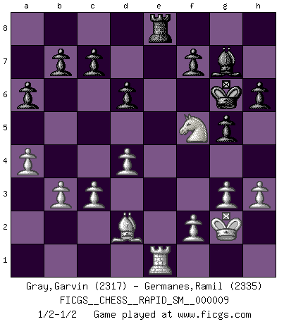 Last move : 1/2-1/2 2013 May 17 14:51:57 [Event "FICGS__CHESS__RAPID_SM__000009"] [Site "FICGS"] [Date "2013.03.04"] [Round "1"] [White "Gray,Garvin"] [Black "Germanes,Ramil"] [Result "1/2-1/2"] [WhiteElo "2317"] [BlackElo "2335"] 1.e4 e5 2.Nf3 Nf6 3.Nxe5 d6 4.Nf3 Nxe4 5.Nc3 Nxc3 6.dxc3 Be7 7.Bc4 O-O 8.O-O Nc6 9.Re1 Bf5 10.Bd3 Qd7 11.Bxf5 Qxf5 12.Qd3 Qh5 13.g3 Bf6 14.Bd2 Rae8 15.Kg2 Qg4 16.b3 h6 17.Rad1 Qg6 18.h3 a6 19.a4 Qxd3 20.cxd3 g5 21.Nh2 Kh7 22.Ng4 Bg7 23.Rxe8 Rxe8 24.d4 Kg6 25.Ne3 Ne7 26.Re1 Nf5 27.Nxf5 1/2-1/2 Petrov : Nimzovich attack Kingside Castling by player Black (move 7) Kingside Castling by player White (move 8) This chess game ended in a draw. Follow this game move after move (download)As one by one I mowed them down, my superiority soon became apparent. (Jose Capablanca) Ihnen, Herr Lasker, habe ich nur drei Worte zu sagen: Schach und matt. (Siegbert Tarrasch) Un mal día en el Ajedrez, es mejor que cualquier buen día en el trabajo. (Anonymous) Toutes choses étant égales, c'est la conviction qui gagne. Alliée à une volonté de vaincre, elle sert de détonateur, suscite des idées, disperse les doutes et aide à penser clairement. (Robert Fischer) A journey of a thousand sites begins with a single click. (Author unknown)