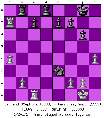 Last move : 1/2-1/2 2013 May 9 10:50:2 [Event "FICGS__CHESS__RAPID_SM__000009"] [Site "FICGS"] [Date "2013.03.04"] [Round "1"] [White "Legrand,Stephane"] [Black "Germanes,Ramil"] [Result "1/2-1/2"] [WhiteElo "2303"] [BlackElo "2335"] 1.d4 Nf6 2.c4 g6 3.Nf3 Bg7 4.Nc3 d5 5.Bf4 O-O 6.Rc1 dxc4 7.e3 Be6 8.Ng5 Bd5 9.e4 h6 10.exd5 hxg5 11.Bxg5 Nxd5 12.Bxc4 Nb6 13.Bb3 Nc6 14.d5 Nd4 15.O-O Qd7 16.Re1 Rfe8 17.h4 Rac8 18.Be3 Nxb3 19.Qxb3 Bxc3 20.Rxc3 Qxd5 21.Rec1 Qxb3 22.Rxb3 Red8 23.a4 Nd5 24.Rxb7 Rb8 25.Rxa7 Nxe3 1/2-1/2 King's Indian, 3.Nf3 Kingside Castling by player Black (move 5) Kingside Castling by player White (move 15) This chess game ended in a draw. Follow this game move after move (download)Chess is so inspiring that I do not believe a good player is capable of having an evil thought during the game. (Wilhelm Steinitz) Es hat in meinem Leben Zeiten gegeben, in denen das Schachspiel, wenn nicht zum Lebenszweck, so doch zu einem regelrechten Lebensersatz geworden ist. Man fühlt sich in solchen Zeiten nicht so, als besäße man eine göttliche Gabe, sondern eher so, als sei man von ihr besessen. (Garry Kasparov) Una compensación adecuada por un sacrificio es tener una combinación sólida que conduce a una posición ganadora; una compensación adecuada por una metida de pata es dejar a tu oponente arrebatar una derrota de las fauces de la victoria. (Bruce A. Moon) Un millionnaire : 'Monsieur Steinitz ! Vous ne participez aux tournois que pour l'argent, alors que moi je n'y viens que pour l'honneur.' Steinitz : 'Chacun joue pour ce qu'il n'a pas'... There's always a bigger fish. (Qui-Gon Jinn in Star Wars ep.1)