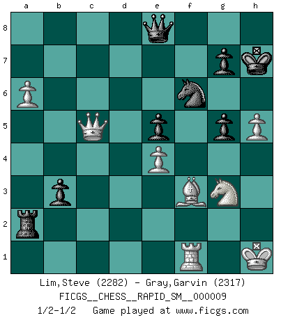 Last move : 1/2-1/2 2013 July 2 12:47:36 [Event "FICGS__CHESS__RAPID_SM__000009"] [Site "FICGS"] [Date "2013.03.04"] [Round "1"] [White "Lim,Steve"] [Black "Gray,Garvin"] [Result "1/2-1/2"] [WhiteElo "2282"] [BlackElo "2317"] 1.d4 Nf6 2.c4 c5 3.d5 b5 4.Nf3 e6 5.dxe6 fxe6 6.cxb5 a6 7.e3 Be7 8.Nbd2 d5 9.b3 axb5 10.Bxb5+ Bd7 11.Bd3 Nc6 12.a3 O-O 13.O-O Bd6 14.Bb2 Rb8 15.Rc1 Qe7 16.e4 d4 17.a4 e5 18.Ba3 Kh8 19.Qc2 Nb4 20.Bxb4 Rxb4 21.a5 Nh5 22.g3 Bh3 23.Rfe1 Rb7 24.Bf1 Bg4 25.Be2 Ra7 26.b4 cxb4 27.Nxd4 Rc7 28.Qb2 Rxc1 29.Qxc1 Bc5 30.Bxg4 Bxd4 31.Rf1 Nf6 32.Be2 Qa7 33.a6 Bxf2+ 34.Kg2 Be3 35.Qc2 Qa8 36.Nc4 Rc8 37.Qd3 Bd4 38.Nd6 Rc3 39.Qb5 Qf8 40.Nf5 Bc5 41.g4 h6 42.h4 Rc2 43.g5 Qe8 44.Qd3 Rc3 45.Qd2 Qg6 46.Bf3 Ra3 47.Ng3 b3 48.Qc3 Ra2+ 49.Kh1 hxg5 50.h5 Qe8 51.Qxc5 Kh7 1/2-1/2 Benko gambit Kingside Castling by player Black (move 12) Kingside Castling by player White (move 13) This chess game ended in a draw. Follow this game move after move (download)Chess, like love, is infectious at any age. (Flohr) Dieses schreckliche Gefühl, dass ich gegen eine Maschine spielte, die niemals Fehler macht, zerschmetterte meinen Widerstand. (Mark Taimanov) Evita las multitudes. Haz independientemente tu propio razonamiento. Trata de ser el jugador de Ajedrez, no la pieza de Ajedrez. (Ralph Charell) Le jeu d'échecs fait naître et fortifie en nous plusieurs qualités précieuses dans le cours de l'existence, telles que la prévoyance, la circonspection, la prudence, et la persévérance. (Benjamin Franklin - 1783, la morale des échecs) Faith : not wanting to know what is true. (Friedrich Nietzsche)