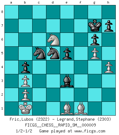 Last move : 1/2-1/2 2013 June 23 8:31:42 [Event "FICGS__CHESS__RAPID_SM__000009"] [Site "FICGS"] [Date "2013.03.04"] [Round "1"] [White "Fric,Lubos"] [Black "Legrand,Stephane"] [Result "1/2-1/2"] [WhiteElo "2322"] [BlackElo "2303"] 1.e4 c5 2.Nf3 d6 3.d4 cxd4 4.Nxd4 Nf6 5.Nc3 a6 6.f3 e5 7.Nb3 Be6 8.Be3 Be7 9.Qd2 O-O 10.O-O-O Nbd7 11.g4 b5 12.g5 b4 13.Ne2 Ne8 14.f4 a5 15.f5 a4 16.fxe6 axb3 17.cxb3 fxe6 18.Bh3 Rxa2 19.Bxe6+ Kh8 20.Ng3 Nc7 21.Bc4 Qa8 22.Rhf1 Rxf1 23.Rxf1 Ra1+ 24.Kc2 Rxf1 25.Bxf1 d5 26.Qf2 g6 27.h4 Kg7 28.Kb1 Qf8 29.exd5 Nxd5 30.Qxf8+ Bxf8 31.Bd2 Bc5 32.Ne4 Be3 33.Be1 Nc5 34.Nd6 1/2-1/2 Sicilian : Najdorf Kingside Castling by player Black (move 9) Queenside Castling by player White (move 10) This chess game ended in a draw. Follow this game move after move (download)Dazzling combinations are for the many, shifting wood is for the few. (Georg Kieninger) Schach ist das Spiel, das die Verrückten gesund hält. (Albert Einstein) El Ajedrez es un juego de pelea el cual es puramente intelectual e incluye la suerte. (Richard Reti) Il n'y a pas eu de défaite parce que je ne crois pas que cet ordinateur ait jamais existé. IBM a triché en refusant d'imprimer les modes de recherche de la machine. C'est évident, pendant le match, des coups décisifs ont été joués par des êtres humains. Aujourd'hui, les meilleurs spécialistes en informatique ne peuvent toujours pas expliquer comment Deep-Blue a pu jouer contre la logique des ordinateurs. IBM a gagné une guerre de communication, mais ils sont incapables de prouver que l'ordinateur a gagné tout seul. (Garry Kasparov) At last I discovered the true beauty of chess. So I proposed to her. (Dinesh De Silva)