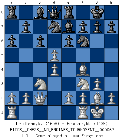 Last move : 1-0 2013 May 6 21:58:36 [Event "FICGS__CHESS__NO_ENGINES_TOURNAMENT__000062"] [Site "FICGS"] [Date "2013.03.04"] [Round "1"] [White "Cridland,Graham"] [Black "Fraczek,Weronika"] [Result "1-0"] [WhiteElo "1608"] [BlackElo "1435"] 1.d4 d5 2.Nf3 Nf6 3.c4 c6 4.Nc3 e6 5.g3 Nbd7 6.Bg2 Be7 7.O-O O-O 8.Qc2 a6 9.Bf4 Re8 10.cxd5 1-0 This chess game has been lost on time (started : 2013.03.04 19:29:17) Queen's pawn game Kingside Castling by player White (move 7) Kingside Castling by player Black (move 7) Player White won this chess game. Follow this game move after move (download)By playing at Chess then, we may learn: First: Foresight... Second: Circumspection... Third: Caution... And lastly, we learn by Chess the habit of not being discouraged by present bad appearances in the state of our affairs, the habit of hoping for a favorable chance, and that of persevering in the secrets of resources. (Benjamin Franklin) Karpov ist ein Museumsstück. (Garry Kasparov) Cuando me preguntan: -¿Cual es el secreto que te hace hacer mejores movidas que tus oponentes?, Yo respondo: Me da gusto que me pregunten eso, porque, como veran, hay una simple razón. Yo pienso mis propias movidas y dejo a mi oponente que el piense las suyas. (Alexander Alekhine) Mon pion favori sur ma case favorite ! Bronstein en parlant d'un coup de pion en h5 quand il avait les Noirs. Art disturbs, science reassures. (Georges Braque, Le Jour et la Nuit)