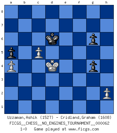 Last move : 1-0 2013 September 22 2:37:33 [Event "FICGS__CHESS__NO_ENGINES_TOURNAMENT__000062"] [Site "FICGS"] [Date "2013.03.04"] [Round "1"] [White "Uzzaman,Ashik"] [Black "Cridland,Graham"] [Result "1-0"] [WhiteElo "1527"] [BlackElo "1608"] 1.e4 c5 2.Nc3 e6 3.f4 d5 4.Bb5+ Bd7 5.Bxd7+ Qxd7 6.e5 Nc6 7.Nf3 Nh6 8.O-O Be7 9.Kh1 O-O 10.d4 Nf5 11.dxc5 Bxc5 12.a3 a6 13.Ne2 Rac8 14.c3 f6 15.Ned4 fxe5 16.Nxc6 Qxc6 17.Nxe5 Qe8 18.Qf3 Kh8 19.Bd2 Bd6 20.Rae1 b5 21.Qh3 Rf6 22.g4 Ne7 23.g5 Rf5 24.Nf3 Bxf4 25.Bxf4 Rxf4 26.Qxe6 Rf7 27.g6 hxg6 28.Ng5 Rxf1+ 29.Rxf1 Nf5 30.Qxd5 Qc6 31.Rd1 Qf6 32.Qd8+ Rxd8 33.Rxd8+ Qxd8 34.Nf7+ Kh7 35.Nxd8 Nd6 36.b3 Kh6 37.Ne6 g5 38.Kg2 Kg6 39.Kf3 Kf6 40.Nc5 a5 41.Ne4+ Ke5 42.Nxd6 Kxd6 43.Ke4 Ke6 44.a4 bxa4 45.bxa4 g4 46.c4 Kd6 47.Kd4 g6 48.c5+ 1-0 This chess game has been lost on time (started : 2013.03.04 19:29:17) Sicilian : Closed Kingside Castling by player White (move 8) Kingside Castling by player Black (move 9) 10 pieces endgame at move 42 : White KPPPP , Black KPPPP WHITE : King + 4 Pawns BLACK : King + 4 Pawns 9 pieces endgame at move 44 : White KPPP , Black KPPPP WHITE : King + 3 Pawns BLACK : King + 4 Pawns 8 pieces endgame at move 45 : White KPPP , Black KPPP WHITE : King + 3 Pawns BLACK : King + 3 Pawns Player White won this chess game. Follow this game move after move (download)Don't even mention losing to me. I can't stand to think of it. (Bobby Fischer) Wenn ich mich einlogge, glauben die Leute gewöhnlich nicht, dass ich es selbst bin und sie fangen an, mir dumme Fragen zu stellen. Und wenn sie es glauben, stellen sie wieder andere dumme Fragen. (Judith Polgar) Yo no le temo a Spassky. Todos saben que yo soy el mejor. Uno no necesita un torneo para probarlo. (Bobby Fischer) Le profane ne songe pas à la somme de jouissance dont il se prive, qui méconnaît ce jeu aux ressources aussi variées que passionnantes. (Jean-Marie Jeanton-Lamarche) We need strong personalities and only one world champion to attract sponsors. (Anatoly Karpov)