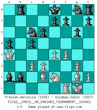 Last move : 1-0 2013 May 5 9:2:13 [Event "FICGS__CHESS__NO_ENGINES_TOURNAMENT__000062"] [Site "FICGS"] [Date "2013.03.04"] [Round "1"] [White "Fraczek,Weronika"] [Black "Uzzaman,Ashik"] [Result "1-0"] [WhiteElo "1435"] [BlackElo "1527"] 1.e4 c5 2.Nc3 g6 3.g3 Bg7 4.Bg2 Nc6 5.d3 d6 6.f4 Qa5 7.Bd2 Qb6 8.a3 Qxb2 9.Rb1 Bxc3 10.Rxb2 Bxb2 11.c3 Be6 12.Qb1 Bxa3 13.Qxb7 Rc8 14.Qa6 Bb2 15.Qb5 Ba3 16.Qa4 Bb2 17.Qc2 Rb8 18.Ne2 a5 19.O-O Ba2 20.Qa4 1-0 Sicilian : Closed Kingside Castling by player White (move 19) Player White won this chess game. Follow this game move after move (download)The Chess pieces are the block alphabet which shapes thoughts; and these thoughts, although making a visual design on the chessboard, express their beauty abstractly, like a poem. (Marcel Duchamp) Privat ist Kortschnoi kein schlechter Mensch, sehr sympathisch. Aber während des Spiels ist er grausam. Er will dich töten. (Miguel Najdorf) Una compensación adecuada por un sacrificio es tener una combinación sólida que conduce a una posición ganadora; una compensación adecuada por una metida de pata es dejar a tu oponente arrebatar una derrota de las fauces de la victoria. (Bruce A. Moon) La tactique, c'est ce que vous faites quand il y a quelque chose à faire; la stratégie, c'est ce que vous faites quand il n'y a rien à faire. (Savielli Tartacower) Every man's memory is his private literature. (Aldous Huxley)