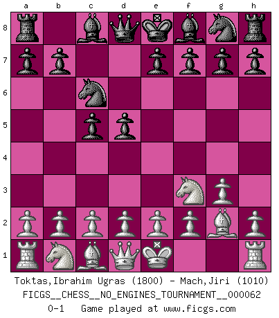 Last move : 0-1 2013 May 1 21:44:59 [Event "FICGS__CHESS__NO_ENGINES_TOURNAMENT__000062"] [Site "FICGS"] [Date "2013.03.04"] [Round "1"] [White "Toktas,Ibrahim Ugras"] [Black "Mach,Jiri"] [Result "0-1"] [WhiteElo "1800"] [BlackElo "1010"] 1.Nf3 d5 2.g3 c5 3.Bg2 Nc6 0-1 This chess game has been lost on time (started : 2013.03.04 19:29:17) Reti : King's Indian attack Player Black won this chess game. Follow this game move after move (download)Later, I began to succeed in decisive games. Perhaps because I realized a very simple truth: not only was I worried, but also my opponent. (Mikhail Tal) Immer nach dem besten Zug zu suchen ist ziemlich unpraktisch. (Nigel Short) Buenas posiciones no logran ganar juegos, buenas movidas sí. (Gerald Abrahams) Karpov est une pièce de musée. (Garry Kasparov) Fear is the path to the dark side. Fear leads to anger; anger leads to hate; hate leads to suffering. I sense much fear in you. (Master Yoda in Star Wars ep.1)