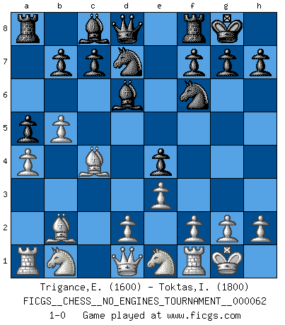 Last move : 1-0 2013 May 17 22:48:19 [Event "FICGS__CHESS__NO_ENGINES_TOURNAMENT__000062"] [Site "FICGS"] [Date "2013.03.04"] [Round "1"] [White "Trigance,Emile"] [Black "Toktas,Ibrahim Ugras"] [Result "1-0"] [WhiteElo "1600"] [BlackElo "1800"] 1.b4 Nf6 2.Bb2 e6 3.a3 a5 4.b5 d5 5.e3 Bd6 6.c4 dxc4 7.Bxc4 O-O 8.Nf3 Nbd7 9.a4 e5 10.O-O e4 11.Ne1 1-0 Polish (Sokolsky) opening Kingside Castling by player Black (move 7) Kingside Castling by player White (move 10) Player White won this chess game. Follow this game move after move (download)I like the moment when I break a man's ego. (Bobby Fischer) Fallen sollten polizeilich verboten werden. (Savielly Grigorievitsch Tartakower) Juega la Apertura como un libro, el Juego Medio como un mago y los Finales como una máquina. (Spielmann) Le jeu d'échecs fait naître et fortifie en nous plusieurs qualités précieuses dans le cours de l'existence, telles que la prévoyance, la circonspection, la prudence, et la persévérance. (Benjamin Franklin - 1783, la morale des échecs) Over-the-board chess is the favorite of mortals, correspondence chess is the favorite of the gods. (Eduard Dyckhoff)