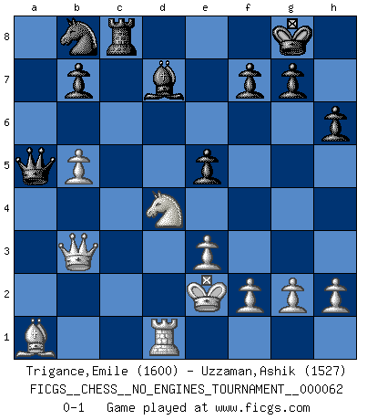 Last move : 0-1 2013 March 26 20:53:0 [Event "FICGS__CHESS__NO_ENGINES_TOURNAMENT__000062"] [Site "FICGS"] [Date "2013.03.04"] [Round "1"] [White "Trigance,Emile"] [Black "Uzzaman,Ashik"] [Result "0-1"] [WhiteElo "1600"] [BlackElo "1527"] 1.b4 e6 2.Bb2 Nf6 3.a3 c5 4.b5 d5 5.e3 Be7 6.c4 O-O 7.Nf3 a6 8.a4 Bd7 9.d4 dxc4 10.Bxc4 axb5 11.axb5 Rxa1 12.Bxa1 cxd4 13.Nxd4 Qc7 14.Nd2 Bb4 15.Qb3 Bxd2+ 16.Kxd2 Ne4+ 17.Ke2 Rc8 18.Bd3 Nc5 19.Qc2 Nxd3 20.Qxd3 Qa5 21.Rd1 h6 22.Qb3 e5 0-1 Polish (Sokolsky) opening Kingside Castling by player Black (move 6) Player Black won this chess game. Follow this game move after move (download)Avoid the crowd. Do your own thinking independently. Be the Chess player, not the Chess piece. (Ralph Charell) Kein Großmeister ist normal. Sie unterscheiden sich nur im Ausmaß Ihrer Verrücktheit. (Viktor Kortschnoi) No es suficiente ser un buen jugador, se debe también de jugar bién. (Siegbert Tarrasch) Les écrivains ont utilisé les échecs pour analyser les côtés extrêmes de la nature humaine. Dans ce cadre, les échecs offrent un champ d'expérimentation idéal. Mais on pourrait faire la même chose avec la peinture. Et là, en vous référant à Van Gogh, vous ne tirerez pas de conclusion définitive sur les peintres. (Gary Kasparov) Chess is as much a mystery as women. (Purdy)