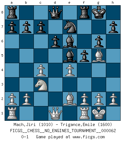 Last move : 0-1 2013 June 4 1:31:54 [Event "FICGS__CHESS__NO_ENGINES_TOURNAMENT__000062"] [Site "FICGS"] [Date "2013.03.04"] [Round "1"] [White "Mach,Jiri"] [Black "Trigance,Emile"] [Result "0-1"] [WhiteElo "1010"] [BlackElo "1600"] 1.c4 g6 2.Nc3 Bg7 3.d4 d6 4.e4 Nd7 5.Nf3 e5 6.Be2 Ne7 7.O-O O-O 8.dxe5 Nxe5 9.Nxe5 Bxe5 10.Bg5 f6 11.Be3 f5 12.Bg5 Be6 0-1 English Opening Kingside Castling by player White (move 7) Kingside Castling by player Black (move 7) Player Black won this chess game. Follow this game move after move (download)Chess is a beautiful mistress. (Bent Larsen) Strategie ist, wie man ein Mädchen auf den Rücksitz bekommt. Taktik ist, was man tut, wenn man dann dort ist. (Anonymous) La señal de un Gran Maestro es su habilidad de ganar una partida rápidamente y sin dolor. (Irving Chernev) Nous vivons dans un monde échiquéen : chaque jour qui passe est un défi à relever. (Philosophe Sasha) You know what they say : You lie down with the Devil, you wake up in Hell. (Horatio Caine, C.S.I. Miami)