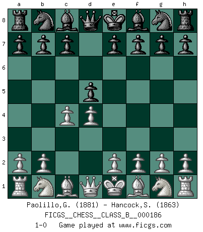 Last move : 1-0 2013 May 3 21:50:28 [Event "FICGS__CHESS__CLASS_B__000186"] [Site "FICGS"] [Date "2013.03.05"] [Round "1"] [White "Paolillo,Giampiero"] [Black "Hancock,Sarah"] [Result "1-0"] [WhiteElo "1881"] [BlackElo "1863"] 1.d4 d5 2.c4 1-0 This chess game has been lost on time (started : 2013.03.05 1:28:48) Queen's Gambit Player White won this chess game. Follow this game move after move (download)When you see a good move, look for a better one. (Emanuel Lasker) Versuche, dich von der Sklaverei der Eröffnungsvarianten zu befreien. Stattdessen soll man gewisse Typenpositionen erlernen, die man eingehend analysiert. (Aaron Nimzowitsch) El Ajedrez es como la guerra en un tablero. (Bobby Fischer) Les réformistes prétendent que les progrès de la théorie conduiront à la disparition des échecs, et qu'il faut, pour leur rendre vie, en remanier les règles. En réalité, qu'exprime cette affirmation? Le mépris de l'intuition, de l'imagination et de tous les autres éléments qui font des échecs un art. (Alexander Alekhine) Knowledge rests not upon truth alone, but upon error also. (Carl G. Jung)