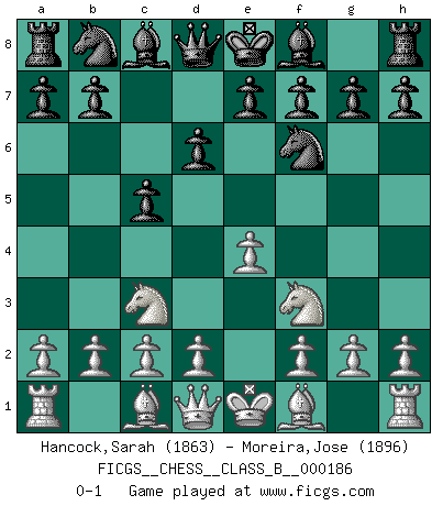 Last move : 0-1 2013 May 2 21:46:12 [Event "FICGS__CHESS__CLASS_B__000186"] [Site "FICGS"] [Date "2013.03.05"] [Round "1"] [White "Hancock,Sarah"] [Black "Moreira,Jose"] [Result "0-1"] [WhiteElo "1863"] [BlackElo "1896"] 1.e4 c5 2.Nc3 d6 3.Nf3 Nf6 0-1 This chess game has been lost on time (started : 2013.03.05 1:28:48) Sicilian : Closed Player Black won this chess game. Follow this game move after move (download)The blunders are all there on the board, waiting to be made. (Savielly Tartakover) Schach ist die gewalttätigste aller Sportarten. (Garry Kasparov) Yo no creo en la psicología. Yo creo en las buenas movidas. (Bobby Fischer) Le profane ne songe pas à la somme de jouissance dont il se prive, qui méconnaît ce jeu aux ressources aussi variées que passionnantes. (Jean-Marie Jeanton-Lamarche) Never risk one's whole fortune unless supported by one's entire army. (Niccolo Machiavelli)
