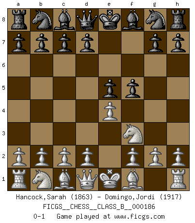 Last move : 0-1 2013 May 2 9:46:24 [Event "FICGS__CHESS__CLASS_B__000186"] [Site "FICGS"] [Date "2013.03.05"] [Round "1"] [White "Hancock,Sarah"] [Black "Domingo,Jordi"] [Result "0-1"] [WhiteElo "1863"] [BlackElo "1917"] 1.e4 e5 2.Nf3 f5 0-1 This chess game has been lost on time (started : 2013.03.05 1:28:48) Latvian counter-gambit Player Black won this chess game. Follow this game move after move (download)In blitz, the Knight is stronger than the Bishop. (Vlastimil Hort) Alles was ich jemals tun will ist Schach spielen. (Robert James Fischer) Por la belleza de sus partidas, la claridad de su juego y lo brillante de sus ideas, Fischer se creó el mismo como un artista de la misma estatura como Brahms, Rembrandt y Shakespeare. (David Levy) L'ordinateur a tué l'originalité. Il n'y a plus guère d'aventures sur l'échiquier. (Jacob Murray) When you stop learning you start dying. (Scott Adams)