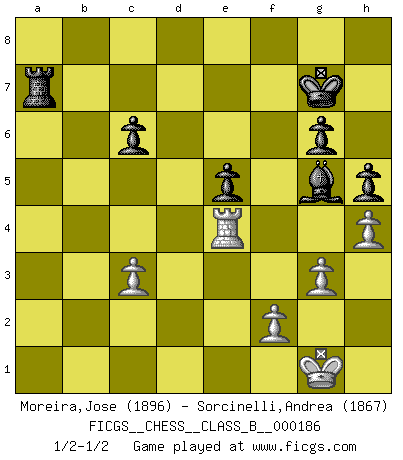 Last move : 1/2-1/2 2013 March 28 18:34:40 [Event "FICGS__CHESS__CLASS_B__000186"] [Site "FICGS"] [Date "2013.03.05"] [Round "1"] [White "Moreira,Jose"] [Black "Sorcinelli,Andrea"] [Result "1/2-1/2"] [WhiteElo "1896"] [BlackElo "1867"] 1.e4 e5 2.Nf3 Nc6 3.Bb5 a6 4.Ba4 Nf6 5.O-O Be7 6.Bxc6 dxc6 7.d3 Nd7 8.Be3 O-O 9.Nbd2 f6 10.Qe2 Qe8 11.Nh4 g6 12.Nhf3 b6 13.Nc4 a5 14.b3 Qf7 15.Rfd1 Ba6 16.h4 h5 17.c3 Rfe8 18.Rac1 Qe6 19.Qc2 Rad8 20.Re1 Qf7 21.Nfd2 Qe6 22.d4 a4 23.Rcd1 Ra8 24.Bh6 Kh7 25.Be3 Kg7 26.Ra1 Red8 27.Red1 Ra7 28.dxe5 fxe5 29.Nf3 axb3 30.axb3 Bxc4 31.bxc4 Rxa1 32.Rxa1 Qxc4 33.Ra7 Bd6 34.Bg5 Re8 35.Be3 Nf6 36.Bxb6 Qxe4 37.Qxe4 Nxe4 38.Bxc7 Re7 39.Ra4 Rxc7 40.Rxe4 Ra7 41.Ng5 Be7 42.g3 Bxg5 1/2-1/2 Ruy Lopez : Exchange variation doubly deferred (DERLD) Kingside Castling by player White (move 5) Kingside Castling by player Black (move 8) This chess game ended in a draw. Follow this game move after move (download)Place the contents of the Chess box in a hat, shake them up vigorously, pour them on the board from a height of two feet, and you get the style of Steinitz. (H. E. Bird) Der beste Spieler in einem Turnier gewinnt es nie. Er landet auf Platz zwei oder drei. (Siegbert Tarrasch) Una mala movida nulifica cuarenta buenas. (Horowitz) Les échecs, c'est l'art d'analyser. (Mikhail Botvinnik) All politicians must be presumed guilty until they are proven innocent. (Dinesh De Silva)