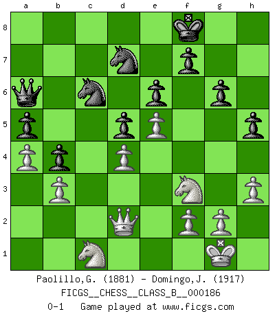 Last move : 0-1 2014 July 19 13:21:24 [Event "FICGS__CHESS__CLASS_B__000186"] [Site "FICGS"] [Date "2013.03.05"] [Round "1"] [White "Paolillo,Giampiero"] [Black "Domingo,Jordi"] [Result "0-1"] [WhiteElo "1881"] [BlackElo "1917"] 1.d4 b5 2.e4 a6 3.Nf3 Bb7 4.Bd3 e6 5.O-O c5 6.c3 Nf6 7.Re1 h6 8.a4 cxd4 9.cxd4 b4 10.b3 Be7 11.Nbd2 Nc6 12.Qe2 d5 13.e5 Nd7 14.Nf1 Qb6 15.Be3 Rc8 16.Rac1 Na5 17.Rxc8+ Bxc8 18.Ng3 Bb7 19.Nd2 g6 20.Rc1 h5 21.h3 Kf8 22.Qd1 Kg7 23.Nf3 Nc6 24.Qd2 Na5 25.Qb2 Nc6 26.Ne2 Rc8 27.Qd2 Kg8 28.Bg5 Bxg5 29.Qxg5 Qd8 30.Qh6 Qf8 31.Qf4 Na5 32.Rxc8 Qxc8 33.Qd2 Nc6 34.Qg5 Qd8 35.Qh6 Qf8 36.Qc1 Qd8 37.Ng3 Qc8 38.Qh6 Qf8 39.Qf4 Qe7 40.Ne2 Kg7 41.Qd2 Nf8 42.Nf4 Na5 43.Qc2 Qd7 44.Qc5 Nc6 45.Ne2 Qc8 46.Qc2 Na5 47.Qd2 Nc6 48.Nc1 a5 49.Ne2 Ba6 50.Bxa6 Qxa6 51.Ng3 Nd7 52.Qg5 Kf8 53.Qh6+ Ke7 54.Qd2 Qb6 55.Ne2 Qa6 56.Nc1 Kf8 0-1 This chess game has been lost on time (started : 2013.03.05 1:28:48) Polish defense Kingside Castling by player White (move 5) Player Black won this chess game. Follow this game move after move (download)I guess a certain amount of temperament is expected of Chess geniuses. (Ron Gross) Es gibt keine einzige Frau, der ich nicht einen Springer vorgeben könnte und trotzdem gewänne. (Robert James Fischer) Tu sabes, camarada Pachman, no disfruto el ser un Ministro, preferería jugar al Ajedrez como tu. (Che Guevara) Le jeu d'échecs fait naître et fortifie en nous plusieurs qualités précieuses dans le cours de l'existence, telles que la prévoyance, la circonspection, la prudence, et la persévérance. (Benjamin Franklin - 1783, la morale des échecs) A person who never made a mistake never tried anything new. (Albert Einstein)