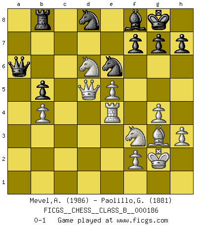 Last move : 0-1 2013 December 28 10:11:55 [Event "FICGS__CHESS__CLASS_B__000186"] [Site "FICGS"] [Date "2013.03.05"] [Round "1"] [White "Mevel,Alberic"] [Black "Paolillo,Giampiero"] [Result "0-1"] [WhiteElo "1986"] [BlackElo "1881"] 1.e4 e5 2.Nf3 Nc6 3.Bb5 a6 4.Ba4 Nf6 5.O-O Nxe4 6.d4 b5 7.Bb3 d5 8.dxe5 Be6 9.Nbd2 Nc5 10.c3 Bg4 11.Bc2 Be7 12.Re1 Qd7 13.Nf1 Rd8 14.Ne3 Bh5 15.b4 Ne6 16.Nf5 O-O 17.a4 Rb8 18.axb5 axb5 19.h3 Bg6 20.Qe2 Ned8 21.g4 Re8 22.Bf4 Ne6 23.Bg3 Bf8 24.Ra6 Ncd8 25.Qd2 c5 26.Nd6 Bxc2 27.Nxe8 Be4 28.Rxe4 Qb7 29.Nd6 Qxa6 30.Qxd5 Qa1+ 31.Kg2 cxb4 32.cxb4 Qa6 0-1 This chess game has been lost on time (started : 2013.03.05 1:28:48) Ruy Lopez : Open, 7.Bb3 Kingside Castling by player White (move 5) Kingside Castling by player Black (move 16) Player Black won this chess game. Follow this game move after move (download)Pawns are born free, yet they are everywhere in chains. (Rick Kennedy) Ich bin stolz ein Bulgare zu sein. (Veselin Topalov) Una buena memoria, concentración, imaginación y una fuerte voluntad, se requiere para llegar a ser un buen jugador. (Bobby Fischer) L'action d'une oeuvre littéraire se déroule sur un champ de bataille. Les masques et les types du drame moderne correspondent aux pièces du jeu d'échecs. L'intrigue correspond aux coups et aux gambits, c'est à dire aux techniques du jeu telles qu'utilisées et interprétées par les joueurs. Les tactiques et les péripéties [mouvements] correspondent aux coups exécutés par l'adversaire. (Viktor Shklovsky) All maxims have their antagonist maxims; proverbs should be sold in pairs, a single one being but a half truth. (William Mathews)