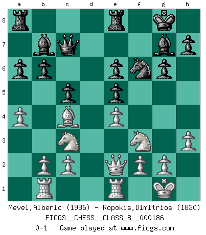 Last move : 0-1 2013 June 6 10:43:26 [Event "FICGS__CHESS__CLASS_B__000186"] [Site "FICGS"] [Date "2013.03.05"] [Round "1"] [White "Mevel,Alberic"] [Black "Ropokis,Dimitrios"] [Result "0-1"] [WhiteElo "1986"] [BlackElo "1830"] 1.e4 c5 2.Nf3 g6 3.d4 Bg7 4.d5 d6 5.Bb5+ Nd7 6.a4 a6 7.Be2 Ngf6 8.Nc3 O-O 9.O-O Rb8 10.Re1 b6 11.h3 Qc7 12.Be3 Bb7 13.Rb1 e6 14.dxe6 fxe6 15.Bc4 Rfe8 16.Bf4 Ne5 17.Bxe5 dxe5 18.Qe2 Ra8 0-1 This chess game has been lost on time (started : 2013.03.05 1:28:48) Sicilian : Hungarian variation Kingside Castling by player Black (move 8) Kingside Castling by player White (move 9) Player Black won this chess game. Follow this game move after move (download)Castle early and often. (Rob Sillars) Garry Kasparov war erst in der Großmeister-Organisation GMA, dann in der Profischach-Vereinigung PCA, zum Schluss kehrte er wieder in den Schoß der FIDE zurück. Aber gut, manche Leute sind flexibel (Viswanathan Anand) Las ideas audaces son como las piezas del Ajedrez que avanzan hacia adelante. Ellas pueden ser vencidas, pero también pueden iniciar una partida victoriosa. (Goethe) RxDa4 pat (...) A married woman is like a fish riding a bicycle. (Rodolfo d'Ettorre)