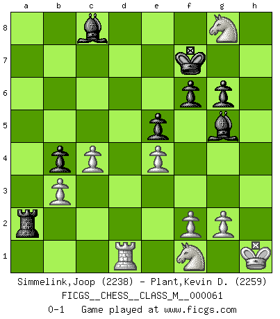 Last move : 0-1 2013 September 3 0:29:46 [Event "FICGS__CHESS__CLASS_M__000061"] [Site "FICGS"] [Date "2013.03.05"] [Round "1"] [White "Simmelink,Joop"] [Black "Plant,Kevin D."] [Result "0-1"] [WhiteElo "2238"] [BlackElo "2259"] 1.e4 e5 2.Nf3 Nc6 3.Bb5 a6 4.Ba4 Nf6 5.O-O Be7 6.Re1 b5 7.Bb3 d6 8.h3 Na5 9.c3 Nxb3 10.axb3 O-O 11.Qc2 Bb7 12.d4 Re8 13.d5 c6 14.dxc6 Bxc6 15.c4 b4 16.Nbd2 Nd7 17.Nf1 Nc5 18.Ng3 g6 19.Be3 Ne6 20.h4 Qc8 21.h5 Qb7 22.Ra5 Bd8 23.R5a1 a5 24.Qd2 Be7 25.Ng5 Nc5 26.Bxc5 dxc5 27.Nf3 Bf8 28.Ra2 Bg7 29.Nh2 Red8 30.Qg5 f6 31.Qe3 Qd7 32.Qxc5 Bf8 33.Qe3 Qd2 34.Ng4 Kf7 35.Rf1 Be7 36.Qb6 Qd7 37.R2a1 Qc8 38.Nh6+ Kg7 39.Qe3 Bd7 40.Rad1 Bc5 41.Qc1 Be6 42.Rd5 a4 43.bxa4 Rxa4 44.Qd2 Bd4 45.b3 Ra6 46.Kh1 Bc3 47.Rxd8 Bxd2 48.Rxc8 Bxc8 49.Ng8 Kf7 50.Rd1 Ra2 51.Nf1 Bg5 52.hxg6+ hxg6 0-1 Ruy Lopez : Closed Kingside Castling by player White (move 5) Kingside Castling by player Black (move 10) Player Black won this chess game. Follow this game move after move (download)Chess is a cold bath for the mind. (Sir John Simon) Ein Isolani verdüstert die Stimmung auf dem ganzen Schachbrett. (Savielly Grigorievitsch Tartakower) Nada excita más a Grandes Maestros aburridos que una novedad teórica. (Dominic Lawson) Ce qui est bien, c'est d'avoir tout un tas de pièces en prise : l'adversaire ne peut en prendre qu'une à la fois. Cité par Thierry Audin. Creativity is inventing, experimenting, growing, taking risks, breaking rules, making mistakes, and having fun. (Mary Lou Cook)