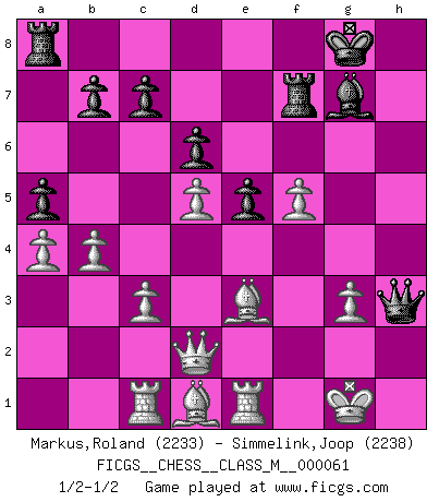 Last move : 1/2-1/2 2013 May 24 9:49:42 [Event "FICGS__CHESS__CLASS_M__000061"] [Site "FICGS"] [Date "2013.03.05"] [Round "1"] [White "Markus,Roland"] [Black "Simmelink,Joop"] [Result "1/2-1/2"] [WhiteElo "2233"] [BlackElo "2238"] 1.e4 e5 2.Nf3 Nc6 3.Bb5 a6 4.Ba4 Nf6 5.d3 d6 6.c3 g6 7.O-O Bg7 8.Re1 O-O 9.Nbd2 Nd7 10.Nf1 Nc5 11.Bc2 Ne6 12.Ng3 Qf6 13.Be3 Nf4 14.h3 Bd7 15.d4 Rfe8 16.a4 a5 17.Qd2 Rad8 18.d5 Ne7 19.Bd1 Bh6 20.Rc1 Qg7 21.Ne2 g5 22.Ng3 f5 23.Nh2 Rf8 24.exf5 Nxf5 25.Nxf5 Bxf5 26.Ng4 Qg6 27.f3 Bg7 28.Nf2 Rf7 29.b4 Ra8 30.Kh2 h5 31.g3 g4 32.fxg4 hxg4 33.hxg4 Qh7+ 34.Kg1 Nh3+ 35.Nxh3 Qxh3 36.gxf5 1/2-1/2 Ruy Lopez : Anderssen variation Kingside Castling by player White (move 7) Kingside Castling by player Black (move 8) This chess game ended in a draw. Follow this game move after move (download)I believe that Chess possesses a magic that is also a help in advanced age. A rheumatic knee is forgotten during a game of Chess and other events can seem quite unimportant in comparison with a catastrophe on the chessboard. (Vlastimil Hort) Frage: Gibt es etwas was Sie mehr lieben als Autobahnen ohne Tempobegrenzungen? - Antwort: Deutsche Frauen ohne Tempobegrenzungen. (Loek van Wely) Después de una mala apertura, hay una esperanza en el juego medio. Pero una vez que estas en finales, el momento de la verdad ha llegado. (Edmar Mednis) 'L'échange des dames est un coup dur pour les deux adversaires...' Un journaliste lors d'une partie du match Spassky-Fischer Watch your thoughts; they become words. Watch your words; they become actions. Watch your actions; they become habits. Watch your habits; they become character. Watch your character; it becomes your destiny. (Frank Outlaw)