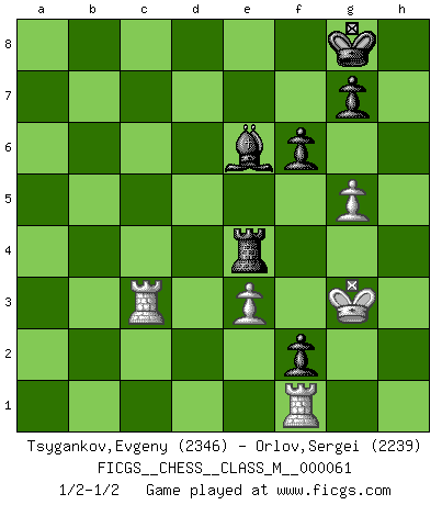 Last move : 1/2-1/2 2013 July 20 14:34:0 [Event "FICGS__CHESS__CLASS_M__000061"] [Site "FICGS"] [Date "2013.03.05"] [Round "1"] [White "Tsygankov,Evgeny"] [Black "Orlov,Vladimir"] [Result "1/2-1/2"] [WhiteElo "2346"] [BlackElo "2239"] 1.d4 Nf6 2.c4 e6 3.Nc3 Bb4 4.e3 b6 5.Nge2 Ba6 6.a3 Bxc3+ 7.Nxc3 d5 8.b3 O-O 9.Be2 Nc6 10.a4 Re8 11.O-O e5 12.Bf3 e4 13.Be2 dxc4 14.Ba3 Nd5 15.Rc1 Qg5 16.h4 Nxc3 17.hxg5 Nxd1 18.Rfxd1 Ne7 19.d5 Rad8 20.bxc4 c5 21.Rc2 Rd6 22.a5 h6 23.gxh6 Rxh6 24.Rcd2 Ng6 25.Bb2 Bc8 26.Ra1 Nh4 27.d6 Bf5 28.axb6 axb6 29.Ra6 Nf3+ 30.Bxf3 exf3 31.Rxb6 Rg6 32.g3 Rd8 33.e4 Bh3 34.Rd5 Bg2 35.Bc1 Re6 36.Be3 f6 37.Kh2 Rxe4 38.Rb7 Bf1 39.Re7 Bxc4 40.Rxc5 Bd3 41.Rc3 Bb1 42.Rb7 Ba2 43.R3c7 Bd5 44.Ra7 Rxe3 45.fxe3 f2 46.Ra1 Rxd6 47.Rf1 Re6 48.Rc3 Re5 49.g4 Re4 50.Kg3 Be6 51.g5 1/2-1/2 Nimzo-Indian : Fischer variation Kingside Castling by player Black (move 8) Kingside Castling by player White (move 11) This chess game ended in a draw. Follow this game move after move (download)Even the laziest King flees wildly in the face of a double check ! (Aaron Nimzowitsch) Du musst nicht gut spielen, es reicht, wenn du besser spielst als dein Gegner. (Anonymous) Una de estas pequeñas movidas modestas pudieran ser mas molestas a tu oponente que la amenaza mas grande. (Siegbert Tarrasch) Les Echecs ne sont pas pour les âmes timides. Ils requièrent un homme entier, qui ne s'arrête pas aveuglément à ce qui a été déjà établi, mais qui tente individuellement de sonder les profondeurs du jeu. (W. Steinitz) Shallow men believe in luck. Strong men belive in cause and effect. (Ralph Waldo Emerson)