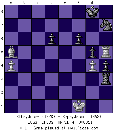 Last move : 0-1 2007 March 8 10:50:40 [Event "FICGS__CHESS__RAPID_A__000011"] [Site "FICGS"] [Date "2007.01.27"] [Round "1"] [White "Riha,Josef"] [Black "Repa,Jason"] [Result "0-1"] [WhiteElo "1920"] [BlackElo "1862"] 1.c4 e5 2.g3 Nf6 3.Bg2 Nc6 4.Nc3 Bb4 5.Nd5 O-O 6.Nxb4 Nxb4 7.d3 h6 8.a3 Nc6 9.b4 d6 10.e3 Bg4 11.Qc2 a6 12.Bb2 Re8 13.Ne2 Qc8 14.h3 Bd7 15.f4 Ne7 16.Qd2 Ng6 17.fxe5 Nxe5 18.Nf4 Bc6 19.Bxc6 bxc6 20.O-O Qf5 21.Qg2 Rab8 22.Bc3 Kh7 23.Qe2 Qg5 24.Kg2 h5 25.e4 h4 26.g4 Kg8 27.Bd2 Nh7 28.Rf2 c5 29.Raf1 c6 30.Nh5 Qd8 31.Bc3 Rb7 32.Rf5 f6 33.Qe3 a5 34.b5 cxb5 35.cxb5 Rxb5 36.Nf4 Qd7 37.Rh5 Rb3 38.Nd5 c4 39.dxc4 Qe6 40.Kg1 Nxc4 41.Qf2 Qxe4 42.Re1 Rb1 43.Rxb1 Qxb1+ 44.Qf1 Qxf1+ 45.Kxf1 Ne3+ 46.Nxe3 Rxe3 47.Bxa5 Rxh3 48.a4 g5 0-1 English Opening Kingside Castling by player Black (move 5) Kingside Castling by player White (move 20) Player Black won this chess game. Follow this game move after move (download)Whoever sees no other aim in the game than that of giving checkmate to one's opponent will never become a good Chess player. (Euwe) Ich liebe den Moment, wenn ich das Ego meines Gegenüber breche. (Robert James Fischer) El Ajedrez es una guerra en un tablero. El objetivo es aplastar la mente del oponente. (Bobby Fischer) Il s'avisa de me proposer d'apprendre les échecs qu'il jouait un peu... me voilà forcené des échecs. J'achète un échiquier, je m'enferme dans ma chambre, j'y passe des jours et des nuits à vouloir apprendre par cur toutes les parties. (Jean-Jacques Rousseau, Confessions) Coffee just isn't my cup of tea. (Unknown)