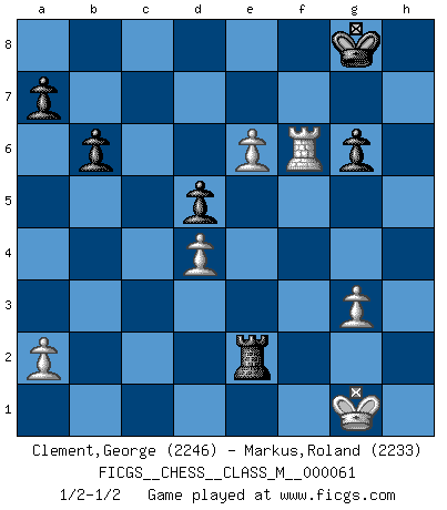 Last move : 1/2-1/2 2013 June 27 21:22:58 [Event "FICGS__CHESS__CLASS_M__000061"] [Site "FICGS"] [Date "2013.03.05"] [Round "1"] [White "Clement,George"] [Black "Markus,Roland"] [Result "1/2-1/2"] [WhiteElo "2246"] [BlackElo "2233"] 1.e4 c6 2.d4 d5 3.e5 Bf5 4.Nf3 e6 5.Be2 c5 6.Be3 cxd4 7.Nxd4 Ne7 8.Nd2 Nbc6 9.N2f3 Be4 10.O-O Bxf3 11.Nxf3 Nf5 12.Bf4 Be7 13.Bd3 g5 14.Bxf5 exf5 15.Be3 f4 16.Bd4 O-O 17.h3 Qd7 18.Re1 Qe6 19.Bc3 Rfd8 20.Nd4 Nxd4 21.Bxd4 Rac8 22.c3 b6 23.Qh5 h6 24.Rad1 Rc6 25.g3 fxg3 26.fxg3 Bc5 27.Kg2 Bxd4 28.Rxd4 Rc4 29.h4 Rxd4 30.cxd4 Rc8 31.hxg5 Rc2+ 32.Kg1 hxg5 33.Qxg5+ Qg6 34.Qxg6+ fxg6 35.Rf1 Rxb2 36.e6 Re2 37.Rf6 1/2-1/2 Caro-Kann : Advance variation Kingside Castling by player White (move 10) Kingside Castling by player Black (move 16) This chess game ended in a draw. Follow this game move after move (download)In a gambit you give up a Pawn for the sake of getting a lost game. (Samuel Standige Boden) Kritik überlasse ich den Spießern. Ich zeige nichts, wofür ich mich schämen muss. (Alexandra Kosteniuk) Alguna parte de un error es siempre correcto. (Savielly Tartakover) Aux échecs, les retours au sommet sont rares : les dommages psychologiques consécutifs à une défaite sont trop sévères. (Daily Telegraph) Cactus - It is depressed cucumber. (Ilmars Cirulis)