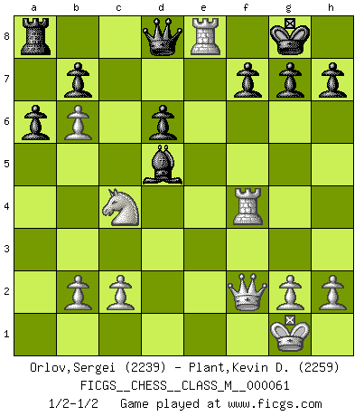 Last move : 1/2-1/2 2013 June 1 10:26:0 [Event "FICGS__CHESS__CLASS_M__000061"] [Site "FICGS"] [Date "2013.03.05"] [Round "1"] [White "Orlov,Vladimir"] [Black "Plant,Kevin D."] [Result "1/2-1/2"] [WhiteElo "2239"] [BlackElo "2259"] 1.e4 c5 2.Nf3 d6 3.d4 cxd4 4.Nxd4 Nf6 5.Nc3 a6 6.Be3 e5 7.Nf3 Qc7 8.a4 Be7 9.a5 O-O 10.Be2 Bd8 11.O-O Nc6 12.Bb6 Qd7 13.Nd2 Bxb6 14.axb6 Nd4 15.Nd5 Nxe2+ 16.Qxe2 Nxd5 17.exd5 Qd8 18.Nc4 Bf5 19.f4 exf4 20.Rxf4 Re8 21.Qf2 Be4 22.Re1 Bxd5 23.Rxe8+ 1/2-1/2 Sicilian : Najdorf, Byrne (English) attack Kingside Castling by player Black (move 9) Kingside Castling by player White (move 11) This chess game ended in a draw. Follow this game move after move (download)I prefer to lose a really good game than to win a bad one. (David Levy) Schach ist ein schwarz-weisser Dschungel. (Garry Kasparov) Tu cuerpo tiene que estar en óptima condición. Tu Ajedrez se deteriora como lo hace tu cuerpo. No puedes separar la mente y el cuerpo. (Bobby Fischer) Il a essayé de se convaincre qu'il pourrait empêcher toutes les erreurs et ne jamais perdre. L'horreur ! Gary Kasparov au sujet de Robert Fischer. You think that education is too expensive ? Try ignorance. (Derek Bok)