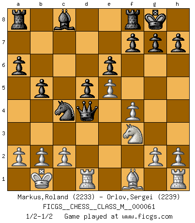 Last move : 1/2-1/2 2013 April 11 7:51:16 [Event "FICGS__CHESS__CLASS_M__000061"] [Site "FICGS"] [Date "2013.03.05"] [Round "1"] [White "Markus,Roland"] [Black "Orlov,Vladimir"] [Result "1/2-1/2"] [WhiteElo "2233"] [BlackElo "2239"] 1.e4 e6 2.d4 d5 3.Nc3 Nf6 4.Bg5 Be7 5.e5 Nfd7 6.Bxe7 Qxe7 7.f4 a6 8.Nf3 c5 9.dxc5 Nc6 10.Qd2 Qxc5 11.O-O-O b5 12.Ne2 O-O 13.Kb1 Nb6 14.Ned4 Nc4 15.Qd3 Nxd4 16.Qxd4 Qxd4 1/2-1/2 French : Classical, Steinitz variation Queenside Castling by player White (move 11) Kingside Castling by player Black (move 12) This chess game ended in a draw. Follow this game move after move (download)The Chess pieces are the block alphabet which shapes thoughts; and these thoughts, although making a visual design on the chessboard, express their beauty abstractly, like a poem. (Marcel Duchamp) Ich moechte nie einem Club beitreten, der Leute wie mich als Mitglieder aufnimmt. (Woody Allen) Una clavada es mas poderosa que una espada. (Fred Reinfeld) Toutes les manuvres exécutées sur une colonne ouverte ont pour but ultime l'intrusion définitive sur la septième ou la huitième rangée, en plein cur de la position ennemie. (Aaron Nimzovitch) The real voyage of discovery consists not in seeking new lands but in seeing with new eyes. (Marcel Proust)