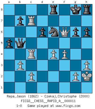Last move : 1-0 2007 May 11 14:39:29 [Event "FICGS__CHESS__RAPID_A__000011"] [Site "FICGS"] [Date "2007.01.27"] [Round "1"] [White "Repa,Jason"] [Black "Czekaj,Christophe"] [Result "1-0"] [WhiteElo "1862"] [BlackElo "2000"] 1.e4 c5 2.Nf3 g6 3.d4 cxd4 4.Nxd4 Nc6 5.Nc3 Bg7 6.Be3 Nf6 7.Bc4 O-O 8.Bb3 a5 9.O-O d6 10.h3 Nxd4 11.Bxd4 Bd7 12.a4 Bc6 13.Qd3 Nd7 14.Bxg7 Kxg7 15.Qd4+ Kg8 16.Rad1 Nc5 17.Bd5 Qb6 18.b3 Nd7 19.Qd2 Qc5 20.Rfe1 Rac8 21.Re3 Kg7 22.Rd3 Rc7 23.Rd4 Ne5 24.Bc4 Qb6 25.Bb5 Rfc8 26.Re1 h6 27.Be2 Qc5 28.Bd1 Rd7 29.Re3 R7d8 30.Rg3 Rh8 31.Nd5 Rce8 32.Kh2 Nd7 33.Bg4 Ne5 34.Be2 Kf8 35.f4 Nd7 36.Bb5 Bxb5 37.axb5 Rb8 38.Rc3 Qxb5 39.Rc7 Nc5 40.Rc4 Re8 41.Nxe7 Ne6 42.Nxg6+ fxg6 43.Qc3 Kg8 44.Qf6 1-0 This chess game has been lost on time (started : 2007.01.27 2:41:15) Sicilian : Hungarian variation Kingside Castling by player Black (move 7) Kingside Castling by player White (move 9) Player White won this chess game. Follow this game move after move (download)Kasparov : J'adoube , Ivanchuk : S'il vous plaît ! (Garry Kasparov & Vassily Ivanchuk, Linares 1997) Schach ist mein Leben, meine Leidenschaft, was ich gelernt habe und seit meinem 14. Lebensjahr profimässig praktiziere. Darauf zu verzichten, würde mir sehr schwer fallen. (Viktor Kortschnoi) El juego de Damas es para vagabundos. (Paul Morphy) Les échecs c'est le défi de l'alpiniste, toujours plus haut, prêt à tout pour monter à l'assaut du Roi ennemi. Les échecs, c'est de la musique en mouvement, un ballet majestueux pour les yeux. C'est de la poésie composée par les fantômes du passé qui au même titre que Rimbaud ou Verlaine méritent notre admiration. Les échecs, c'est de la peinture ou le moindre mouvement modifie le tableau pour en faire un Picasso ou un Van Gogh. Les échecs, c'est tout et rien, c'est la vie et la mort. Jjulie33 sur le forum de France-Echecs. Work expands to fill the time available. (C. Northcote Parkinson, in Parkinson's Laws)