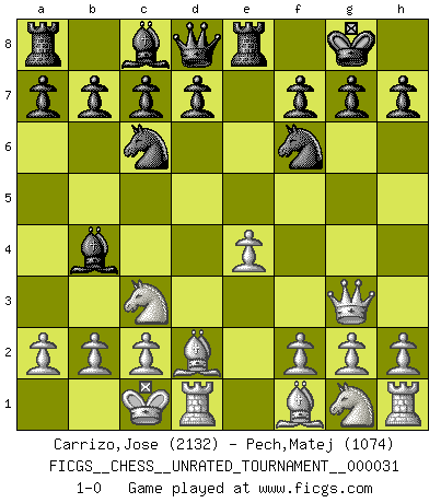 Last move : 1-0 2013 May 13 8:12:11 [Event "FICGS__CHESS__UNRATED_TOURNAMENT__000031"] [Site "FICGS"] [Date "2013.03.08"] [Round "1"] [White "Carrizo,Jose"] [Black "Pech,Matej"] [Result "1-0"] [WhiteElo "2132"] [BlackElo "1074"] 1.e4 e5 2.d4 exd4 3.Qxd4 Nc6 4.Qe3 Nf6 5.Nc3 Bb4 6.Bd2 O-O 7.O-O-O Re8 8.Qg3 1-0 This chess game has been lost on time (started : 2013.03.08 14:40:0) Centre game : Berger variation Kingside Castling by player Black (move 6) Queenside Castling by player White (move 7) Player White won this chess game. Follow this game move after move (download)A player surprised is half beaten. (Proverb) Das typische an einem Großmeister ist, daß er eine gewonnene Position schnell und schmerzlos gewinnt. (Irving Chernev) Los Peones son nacidos libres, y aún así, se encuentran encadenados por todos lados. (Rick Kennedy) Nous sommes les pions de la mystérieuse partie d'Echecs jouée par Dieu. Il nous déplace, nous arrête, nous pousse encore, puis nous lance un à un dans la boîte du Néant. Epitaphe sur la tombe de David Janowsky (1868-1927). Methinks King Thibault should dub Marius Zubac a knight of the square board... I mean table, henceforth addressing him as Sir Marius, and bestow on him a suitable land from the kingdom of FICGS & marry him off to a worthy, fair maiden, lest he slice our heads with his mighty sword in his wrath. (Dinesh De Silva)