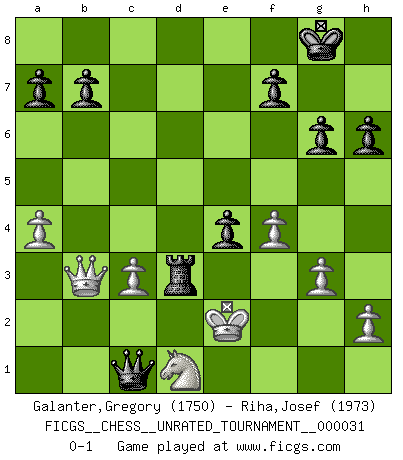 Last move : 0-1 2013 July 13 3:11:42 [Event "FICGS__CHESS__UNRATED_TOURNAMENT__000031"] [Site "FICGS"] [Date "2013.03.08"] [Round "1"] [White "Galanter,Gregory"] [Black "Riha,Josef"] [Result "0-1"] [WhiteElo "1750"] [BlackElo "1973"] 1.e4 c5 2.Nf3 d6 3.g3 Nc6 4.Bg2 g6 5.O-O Bg7 6.d3 Nf6 7.c3 O-O 8.Nbd2 e5 9.a4 h6 10.Nc4 Be6 11.Nh4 d5 12.exd5 Bxd5 13.Be3 Bxg2 14.Nxg2 Qd5 15.f4 Nd7 16.Qf3 Qxd3 17.Rad1 Qxc4 18.Rxd7 e4 19.Qd1 Rfd8 20.Rxd8+ Rxd8 21.Qc2 Nd4 22.Bxd4 Bxd4+ 23.Rf2 Bxf2+ 24.Kxf2 Rd3 25.Ne3 Qa2 26.Ke2 Qa1 27.Nd1 c4 28.b3 cxb3 29.Qxb3 Qc1 0-1 This chess game has been lost on time (started : 2013.03.08 14:40:0) Sicilian Kingside Castling by player White (move 5) Kingside Castling by player Black (move 7) Player Black won this chess game. Follow this game move after move (download)A Chess game is a dialogue, a conversation between a player and his opponent. Each move by the opponent may contain threats or be a blunder, but a player cannot defend against threats or take advantage of blunders if he does not first ask himself: What is my opponent planning after each move ? (Bruce A. Moon) Ich moechte nie einem Club beitreten, der Leute wie mich als Mitglieder aufnimmt. (Woody Allen) No nos podemos resistir a la fascinación de un sacrificio ya que la pasión por los sacrificios es parte de la naturaleza de un jugador de Ajedrez. (Rudolf Spielman) Comme les marins qui ont mille raisons différentes d'aller en mer, les joueurs d'échecs en ont tout autant avant de s'installer devant une table et jouer... (Vincent Bertignac, philosophe) Tomorrow's what you make of it. (Horatio Caine, C.S.I. Miami)