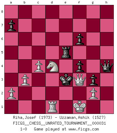 Last move : 1-0 2013 April 2 11:29:46 [Event "FICGS__CHESS__UNRATED_TOURNAMENT__000031"] [Site "FICGS"] [Date "2013.03.08"] [Round "1"] [White "Riha,Josef"] [Black "Uzzaman,Ashik"] [Result "1-0"] [WhiteElo "1973"] [BlackElo "1527"] 1.Nf3 c5 2.e4 g6 3.d4 cxd4 4.Nxd4 Nc6 5.c4 Bg7 6.Be3 d6 7.Nc3 Nf6 8.Be2 O-O 9.O-O Nxd4 10.Bxd4 Be6 11.f4 Qc8 12.b3 Bg4 13.Bxg4 Nxg4 14.Bxg7 Kxg7 15.Kh1 h5 16.Qd4+ f6 17.Rfd1 Rd8 18.h3 Rh8 19.hxg4 hxg4 20.Kg1 g3 21.e5 Qg4 22.exf6+ exf6 23.Qxd6 Qh4 24.Qc7+ Kh6 25.Ne2 Rh7 26.Rd7 Rxd7 27.Qxd7 g5 28.Qxb7 Re8 29.Kf1 gxf4 30.Qf3 Kg5 31.Rd1 Re3 32.Qd5+ Re5 33.Qg8+ Kf5 34.Nd4+ Ke4 35.Qa8+ Ke3 36.Qf3+ 1-0 Reti Opening Kingside Castling by player Black (move 8) Kingside Castling by player White (move 9) Player White won this chess game. Follow this game move after move (download)Without error there can be no brilliancy. (Emanuel Lasker) Zeige mir drei Eröffnungsvarianten und ich beweise dir, dass zwei davon inkorrekt sind. (Emanuel Lasker) El Ajedrez es realmente noventa y nueve por ciento calculación. (Soltis) Horreur, mais aussi harmonie suprême : qu'y avait-il en effet au monde en dehors des échecs ? Le brouillard, l'inconnu, le non-être... (Vladimir Nabokov) Perception is reality. (Immanuel Kant)